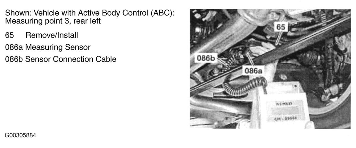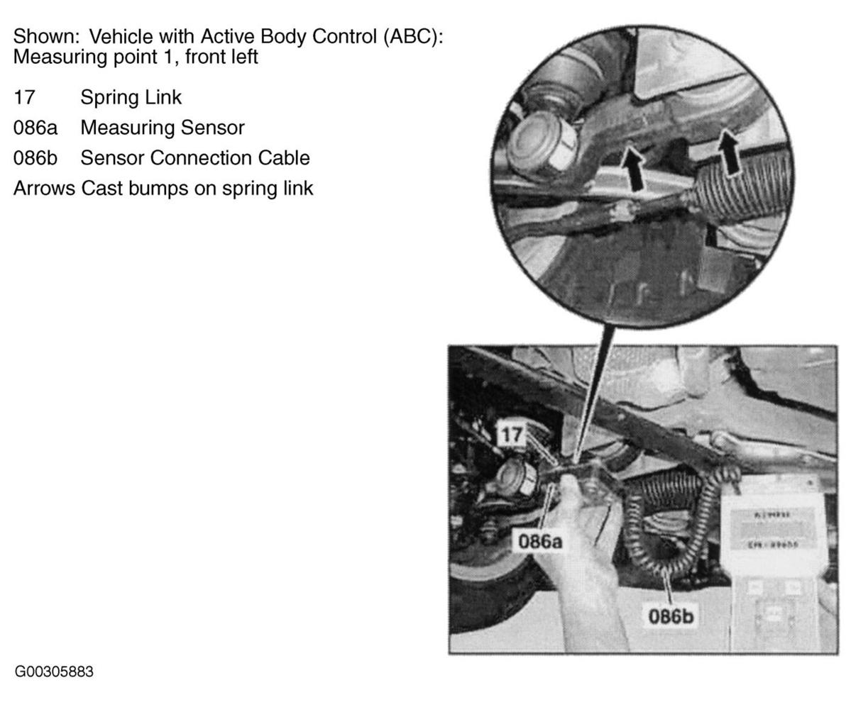 230 Chassis require the use of electronic inclination measuring instrument (CM-9606) to measure front and rear vehicle level (ride height). See Fig 1 , Fig 2 and Figure . Vehicles with Active Body Control (ABC) requires the use of Mercedes-Benz "STAR DIAGNOSIS" compact PC (6511 1801 00), to diagnose the system if ride height is not within specification. It is necessary to check vehicle riding height using a servicing pit or alignment rack. Vehicle weight must be on wheels. See instrument(s) manufacturer for tool usage.
