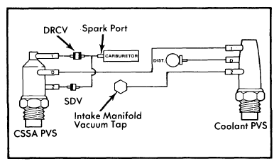 - To test both CSSA PVS and Coolant PVS, connect a vacuum gauge to port "D" and an unrestricted vacuum source to port "2". See Fig 1. With engine cold, no vacuum should be indicated. Warm engine to normal operating temperature and vacuum should be indicated at CSSA PVS with engine at normal idle.