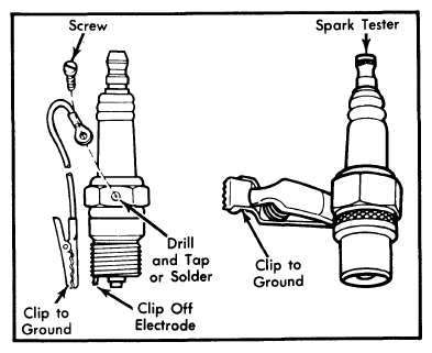 Either use a spark tester tool or modify a spark plug (cut off side terminal and install spring clip for grounding plug housing) for use in testing ignition system. See Fig 1.
