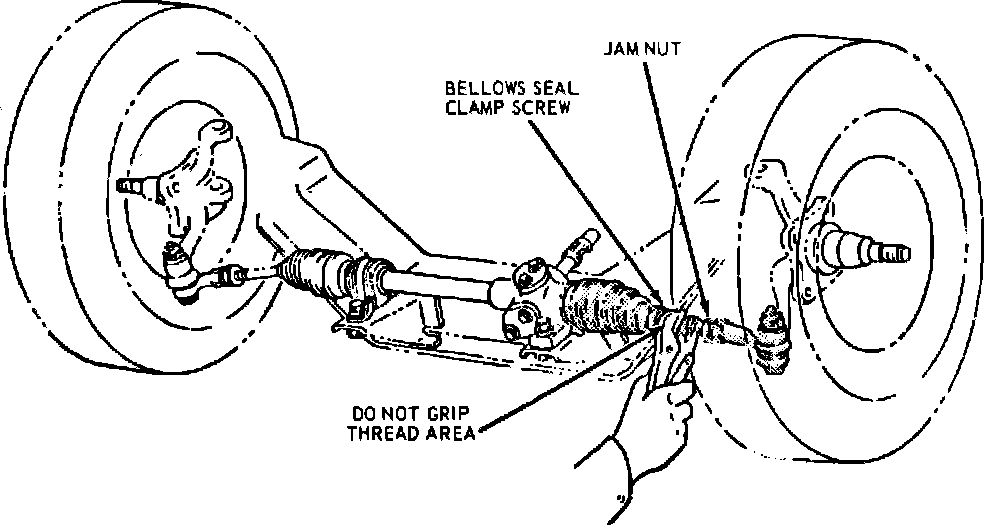 4. Use suitable pliers to turn the tie rod inner end to correct the adjustment to specifications. Do not use pliers on tie rod threads. Turning to reduce number of threads showing will increase toe-in. Turning in the opposite direction will reduce toe-in. On 1981 models, torque tie rod jam nuts to 35-50 ft lb. On 1982-86 models, torque to 43-50 ft lb.
