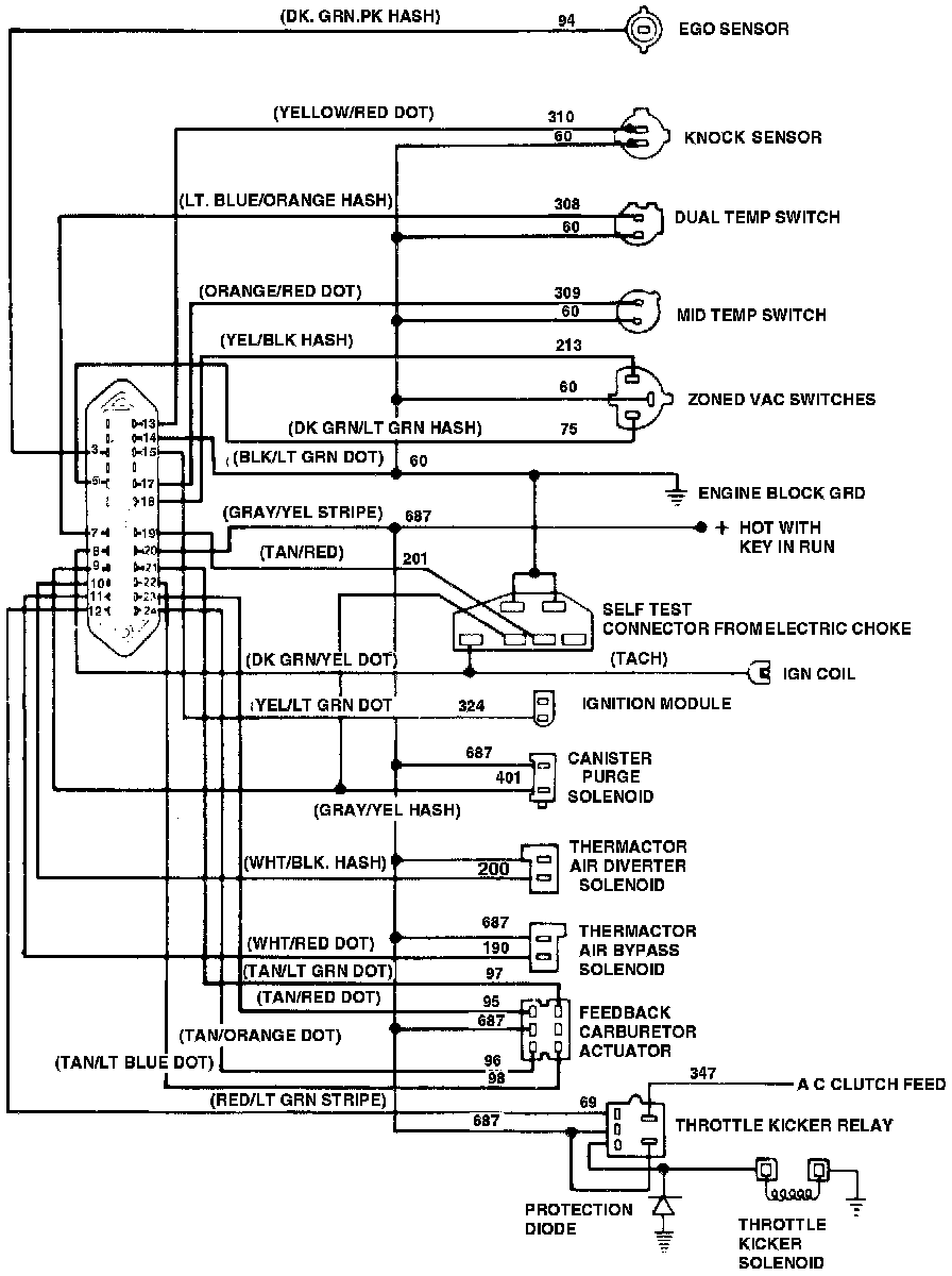 5. With engine still at 1200 rpm, disconnect ignition module (connector with yellow and black/white wires). If timing retards, check circuit 324 for short to ground. If circuit is okay, replace MCU unit and retest. If timing does not retard, check circuit 324 for open circuit. If circuit is okay, Replace MCU unit and retest.