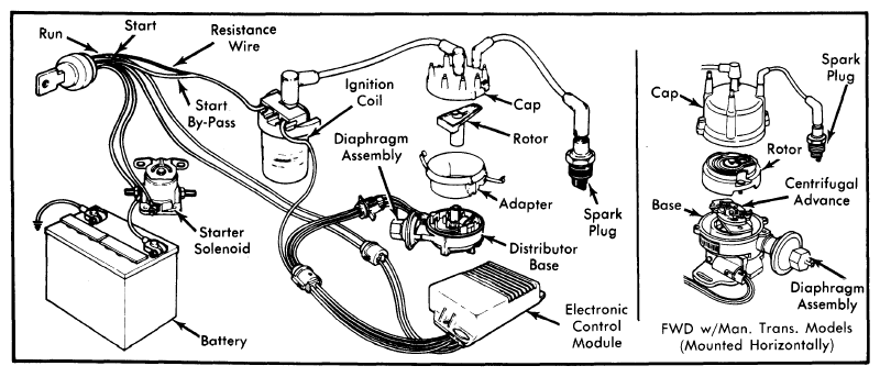Dura-Spark II systems (except front wheel drive models) have an adapter between the distributor housing and cap. See Figure. Distributor caps are larger than for conventional distributors and have male terminals. Distributors have both centrifugal and vacuum advance mechanisms.