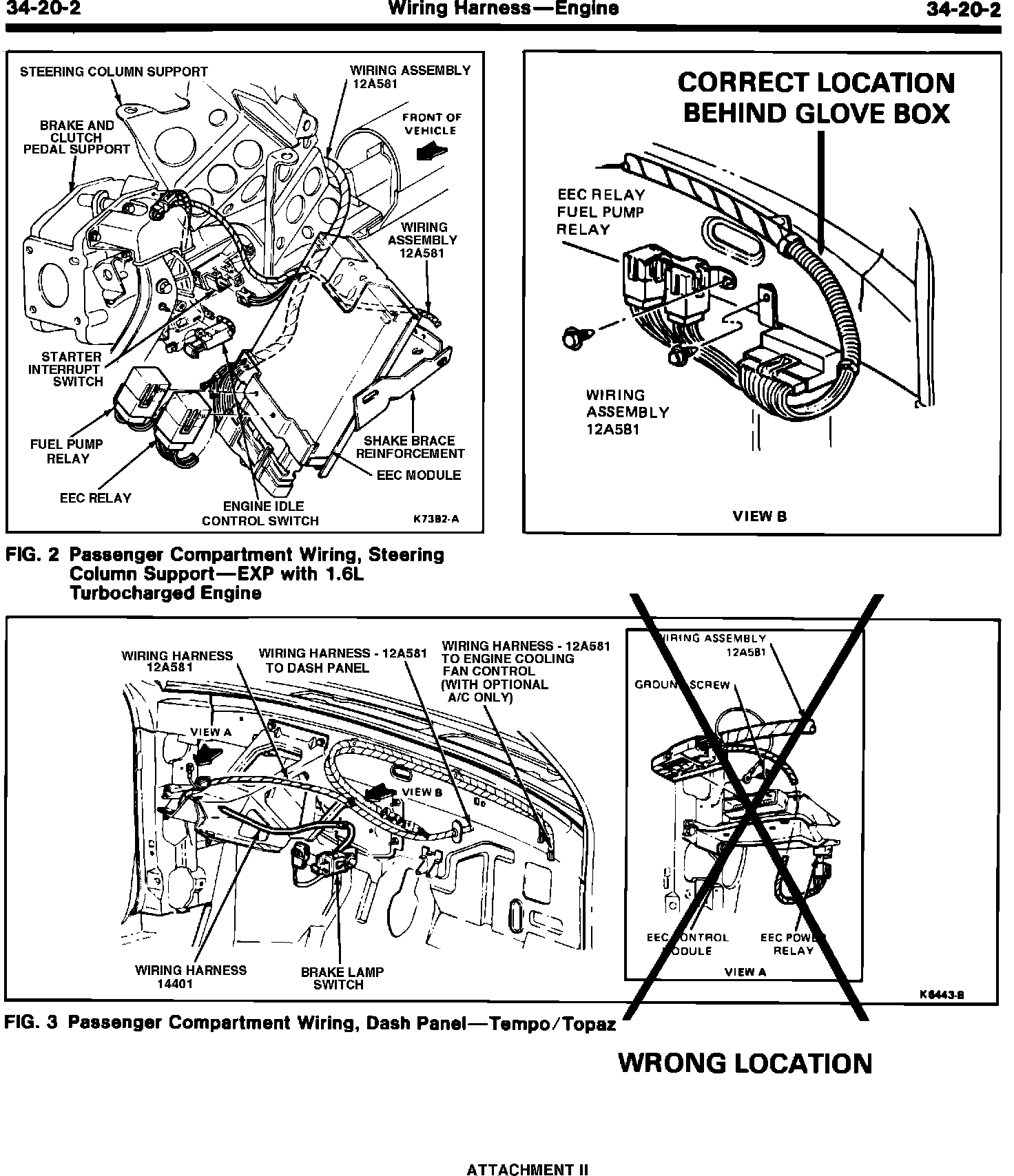 Attachment II illustrates the correct location of the EEC power relay which is behind the glove box. Originally, the 1985 Car Shop Manual, Volume C, Section 34-20-2, showed the EEC power relay location adjacent to the EEC control module.