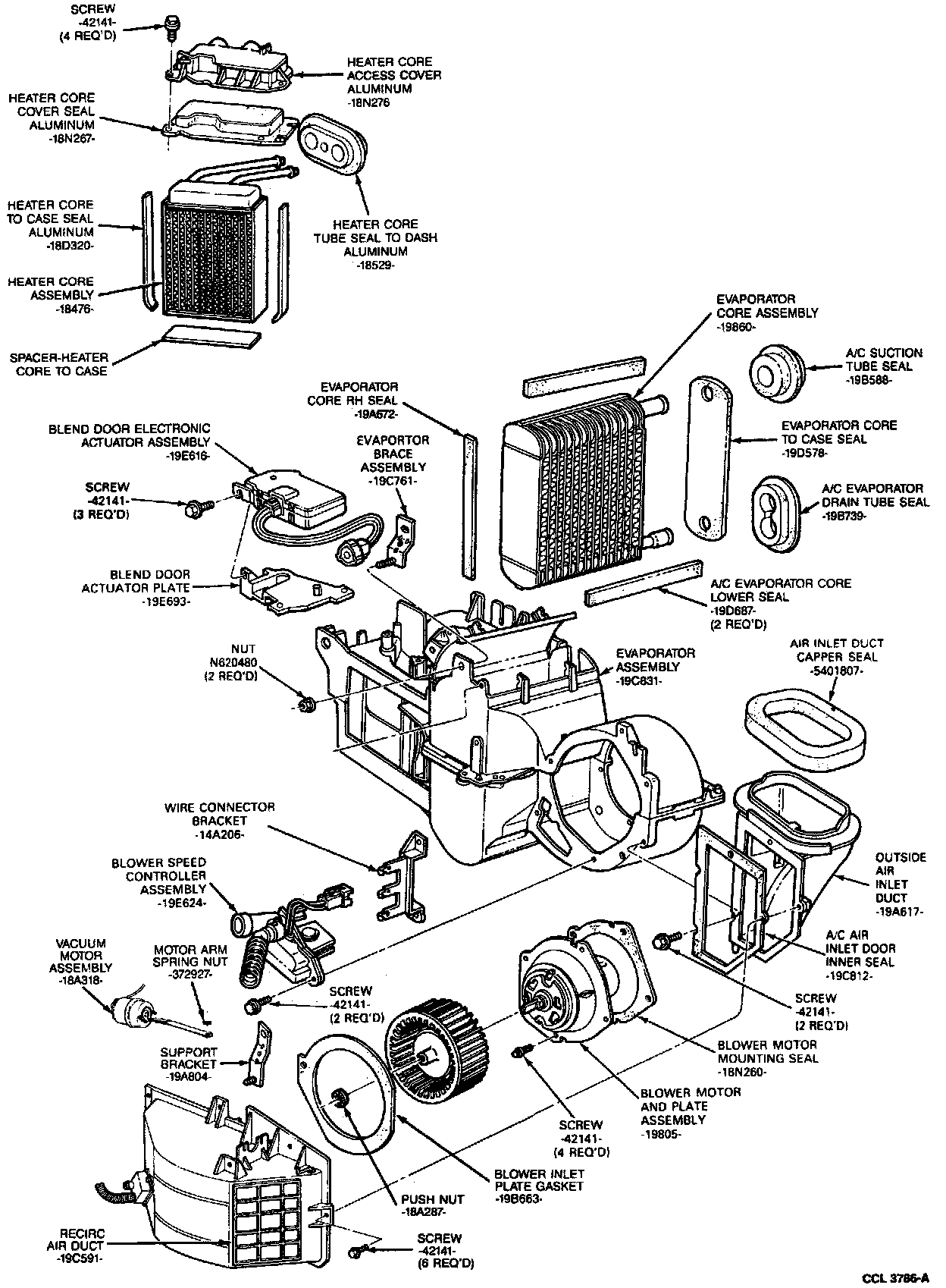 2. Working through the glove compartment opening, disconnect the electrical snap-lock connector and the aspirator hose at the blower motor controller. Also, disconnect the snap-lock connector from its mounting bracket.