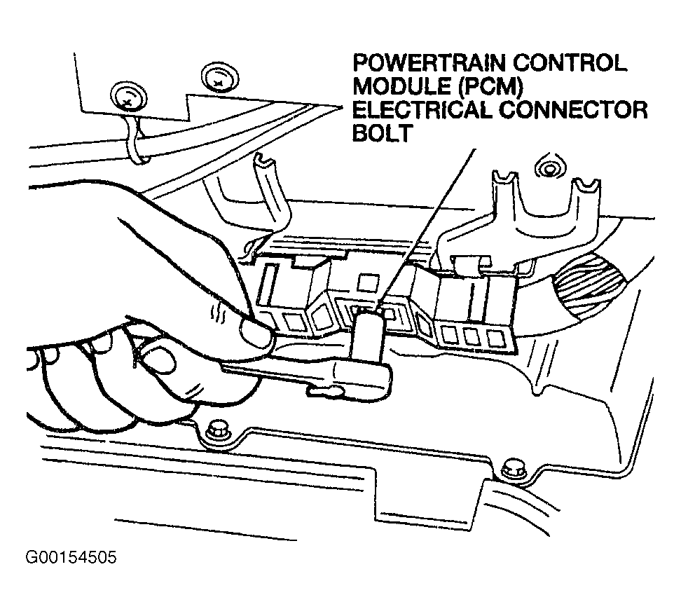 - Remove the Powertrain Control Module (PCM) electrical connector bolt. Pull the connector from the PCM and position aside. See Fig 1 .