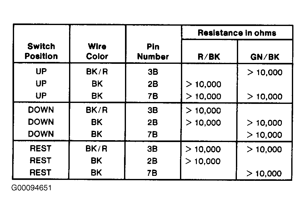 With the ignition key in the OFF position, disconnect right power window switch connector. Measure resistance of Red/Black and Green/Black wire terminals on the right power window switch, with the switch in the correct position. See Figure and Fig 1 . Are all resistances correct? If yes, go to the next step. If no, replace the left power window switch.