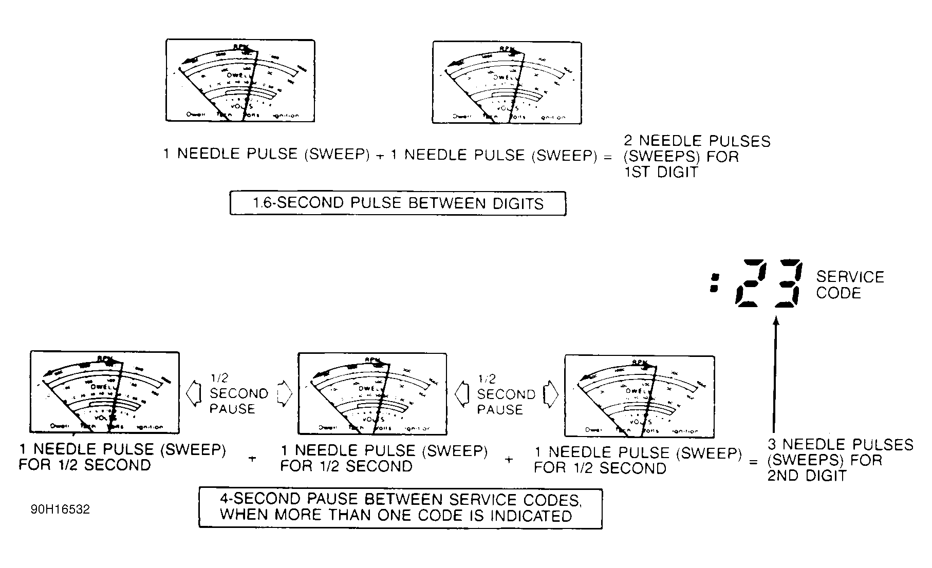Service codes are displayed as timed pulses, and may be read with a VOM, NGS, or Super Star II tester. VOM displays codes by needle sweeps. See Fig 1 .