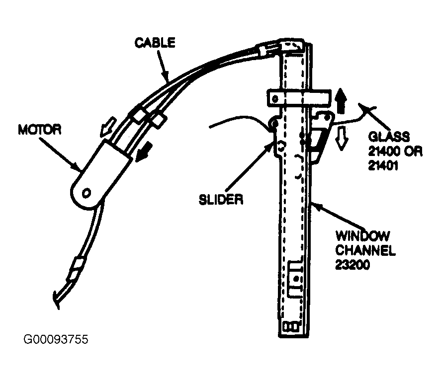 The front door windows are operated by two encased cables. The cables are attached from the motor to the regulator's slider bracket. The cables are secured by nylon fasteners inside the door. Lubrication of the cables is not necessary.