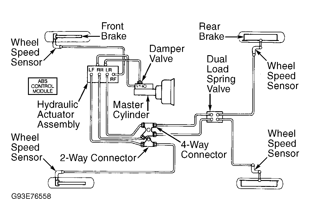 The 4-wheel Anti-Lock Brake System (ABS) is designed to allow vehicle to stop in the shortest possible distance while maintaining full steering control. ABS system consists of ABS control module, hydraulic actuator assembly, master cylinder, power brake booster, wheel speed sensors, wheel speed sensor rotors, front disc brakes, rear drum brakes, hydraulic actuator motor relay and hydraulic actuator solenoid relay. See Fig 1 . ABS uses electronic and hydraulic components to prevent the 4 wheels from locking up during brake application. ABS does not function during normal (light) braking applications.