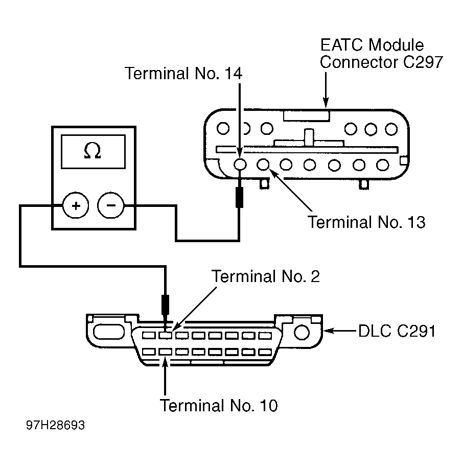 2. Measure resistance of Pink/Light Blue wire between EATC module connector C297, terminal No. 13 and DLC, terminal No. 10. See Fig 1. If resistance is less than 5 ohms, go to next step. If resista nce is more than 5 ohms, repair open in Pink/Light Blue wire between EATC module connector and DLC and retest system.