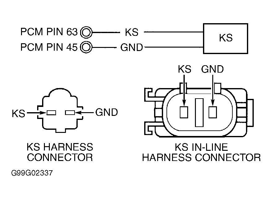 Measure resistance between ground and KS circuit at KS terminal. If resistance is 500-620 k/ohms, replace PCM. If resistance is not 500-620 k/ohms, replace KS.