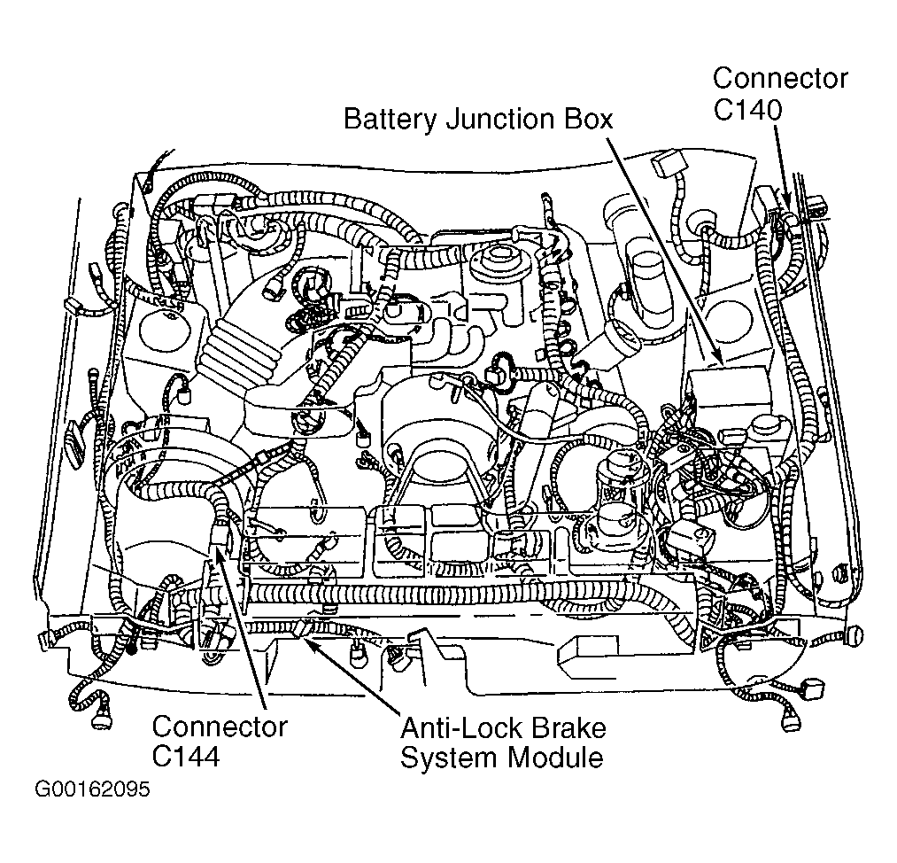 - Turn ignition switch to LOCK position. Disconnect Anti-Lock Brake System (ABS) control module 30-pin harness connector C135. See Fig 1. ABS control module is located in right front of engine compartment, behind radiator. See Figure. Inspect connector for loose, damaged or corroded terminals. If connector terminals are faulty, repair or replace as necessary. If connector terminals are okay, reconnect ABS module harness connector C135, and connect Worldwide Diagnostic System (WDS) tester or New Generation Star (NGS) tester to Data Link Connector (DLC). See Figure. DLC is located under instrument panel between steering column and the radio. See Figure. Turn ignition switch to RUN position and perform data link diagnostic procedure. See DATA LINK DIAGNOSTIC TEST under SELF-DIAGNOSTIC SYSTEM. If ABS: NO RESPONSE ON CKT 914 (BUS +) was retrieved, go to next step. If ABS: NO RESPONSE ON CKT 914 (BUS +) was not retrieved, go to step 6.