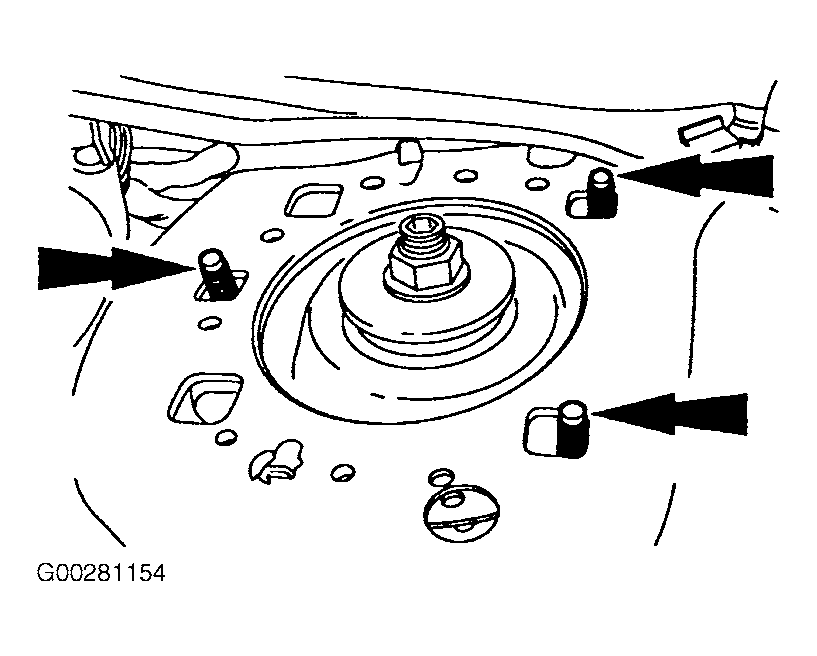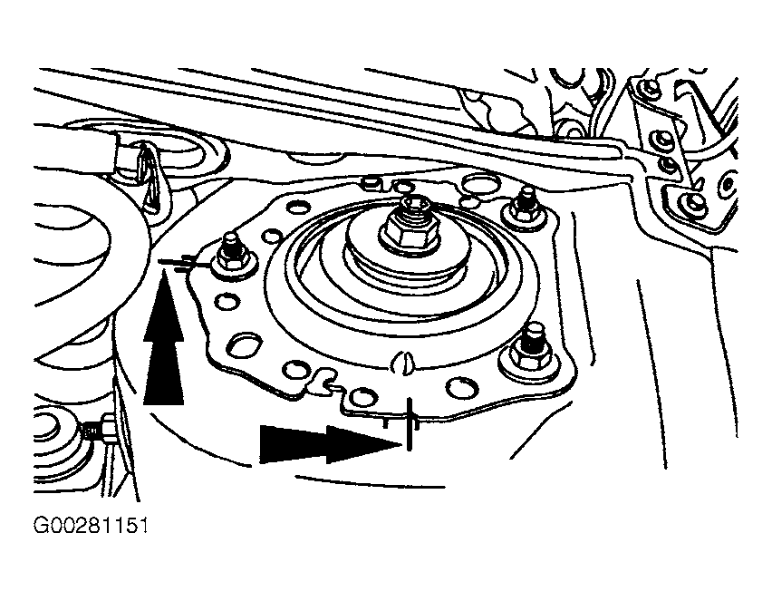 - Position the vehicle on a hoist. Raise the vehicle enough to push the strut downward. The strut studs must be below the alignment plate. Using a screwdriver, carefully pry the two tabs up and off the alignment plate. See Fig 3 .