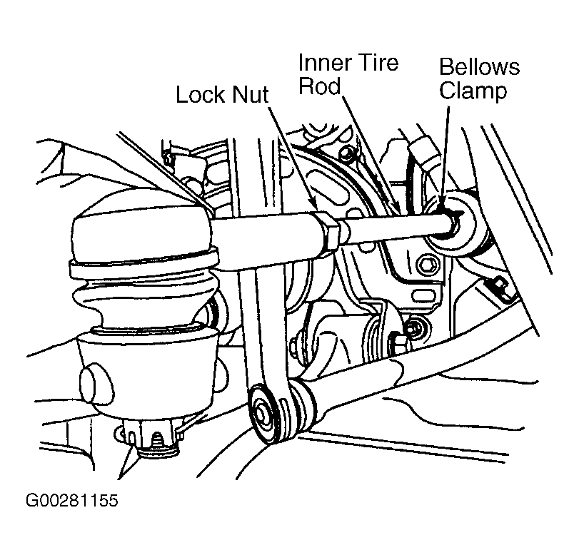 Ensure steering wheel is centered, and maintains centered. Reposition the bellows clamps as necessary. See Fig 1 . Do not allow the steering gear bellows to twist when the front wheel spindle tie rod is rotated. Loosen tie rod end lock nuts. Clean and lubricate tie rod threads. Turn inner tie rod to adjust toe-in. See WHEEL ALIGNMENT SPECIFICATIONS  . Tighten tie rod end lock nut to specification. See TORQUE SPECIFICATIONS  . Ensure bellows clamps are in place.