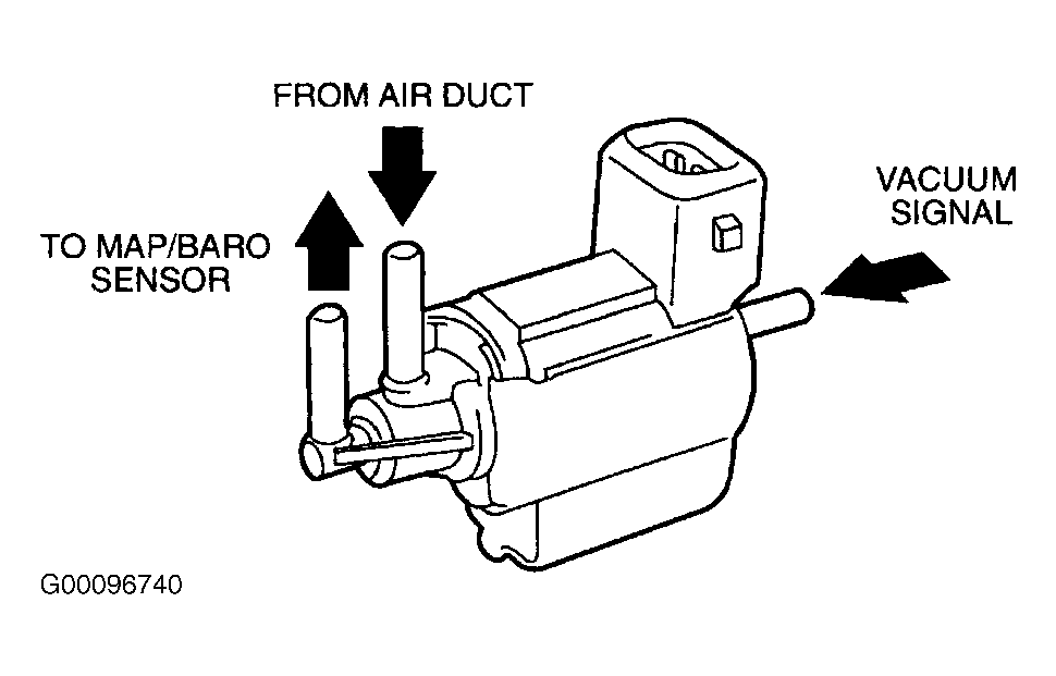 Remove MAP/BARO solenoid. Connect a jumper wire between battery power and solenoid terminal No. 2. Connect another jumper wire between negative battery terminal and solenoid terminal No. 1. Blow air into port "A" of MAP/BARO solenoid. There should be air flow between ports "A" and "C", and no air flow between ports "B" and "C". Remove both jumper wires from solenoid. Blow air into port "A". There should be air flow between ports "B" and "C", and no air flow between ports "A" and "C". See Figure. Replace solenoid if operation is not as specified. If solenoid operates as specified, replace PCM.