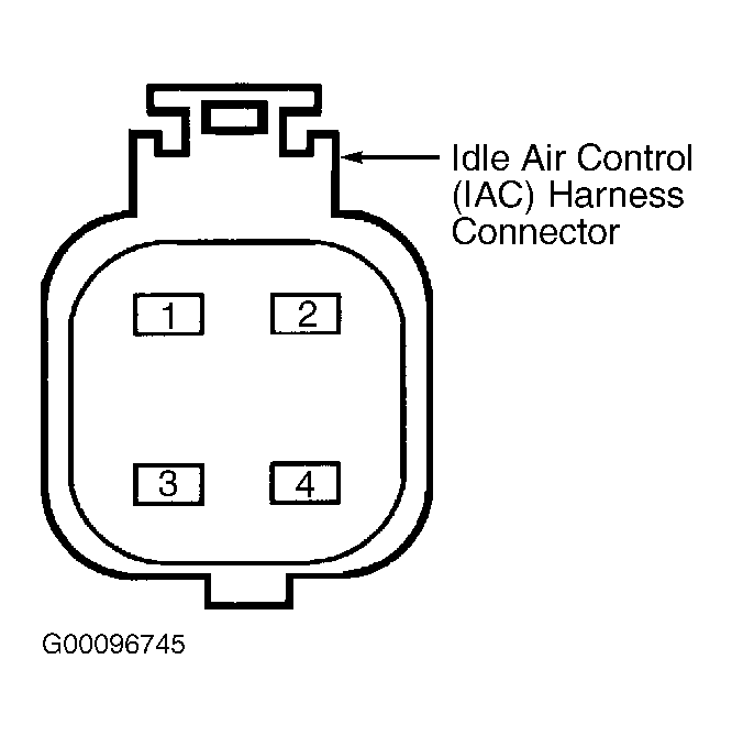 Turn ignition on. Using DVOM, measure voltage between negative battery terminal and IGN START/RUN circuit at IAC valve harness connector terminal No. 1 (Blue/Yellow wire). See Figure. If voltage is more than 10 volts, go to next step. If voltage is 10 volts or less, repair open in Blue/Yellow wire. See WIRING DIAGRAMS article. - 3) Check IAC Circuit For Open Or Short To Ground
