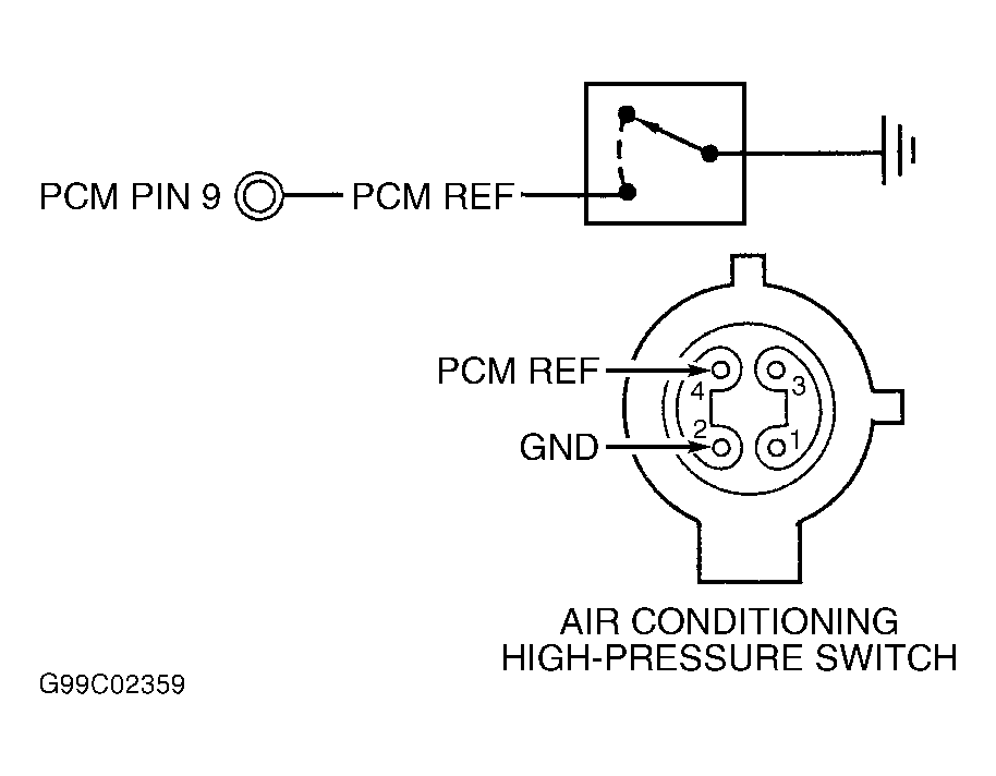 Turn ignition off. Disconnect A/C high pressure switch. Using DVOM, measure resistance between chassis ground and GND circuit at high pressure switch harness connector terminal No. 2 (Black wire). See Figure. If resistance is less than 5 ohms, go to next step. If resistance is 5 ohms or more, repair open in ground circuit. See WIRING DIAGRAMS in AUTOMATIC A/C-HEATER SYSTEMS - VILLAGER or MANUAL A/C-HEATER SYSTEMS - VILLAGER article. - 11) Check PCM REF Circuit To PCM For Open