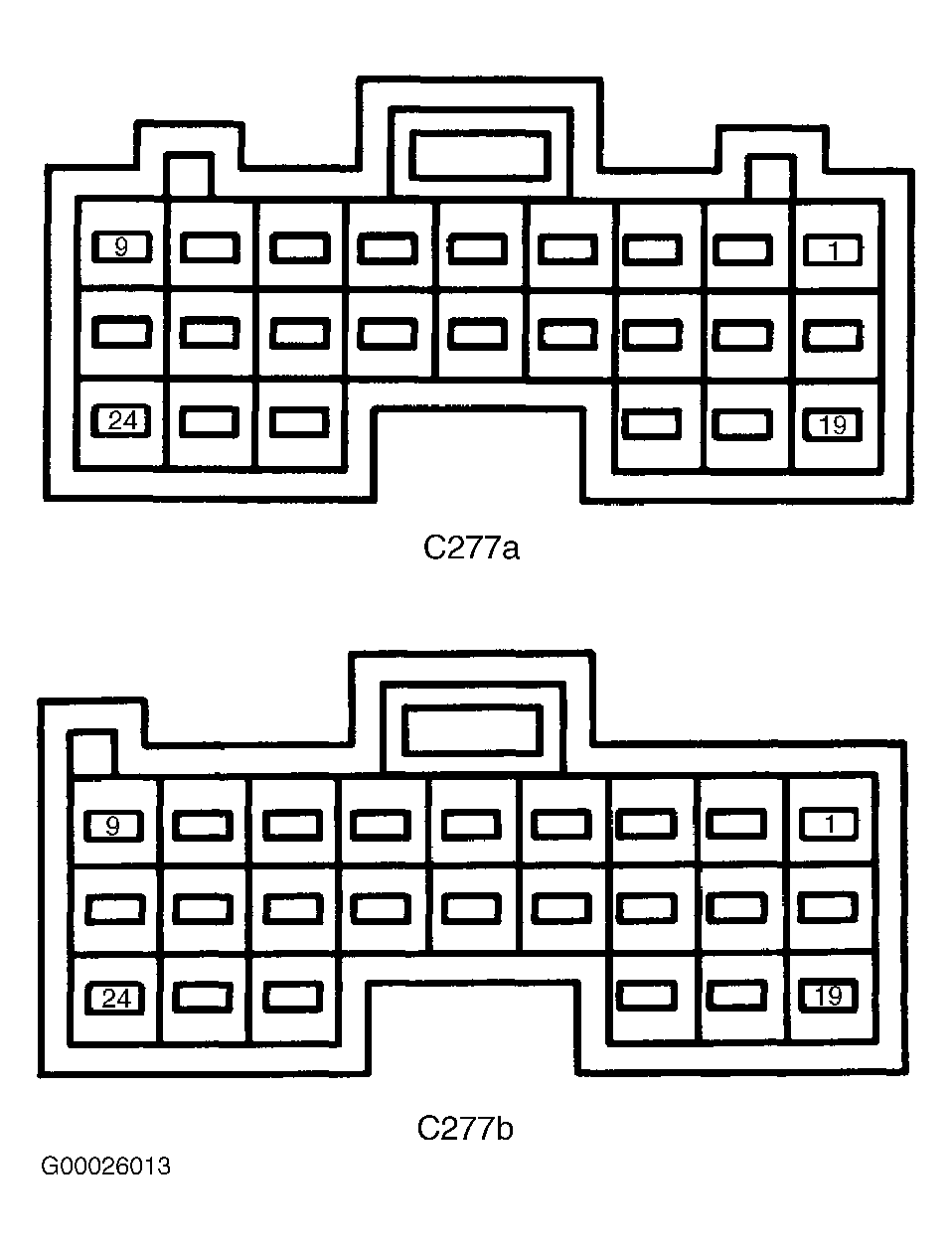 Turn ignition off. Disconnect PCM harness connector. Inspect connector for damaged pins and repair if necessary. Using DVOM, measure resistance of SIG RTN circuit (Black/Yellow wire) between PCM harness connector terminal No. 58 and TCM harness connector C277b terminal No. 18. See Figure and Figure . If resistance is less than 5 ohms, go to next step. If resistance is 5 ohms or more, repair open in SIG RTN circuit. See WIRING DIAGRAMS article. - 5) Check TP SIG Circuit For Open In Harness