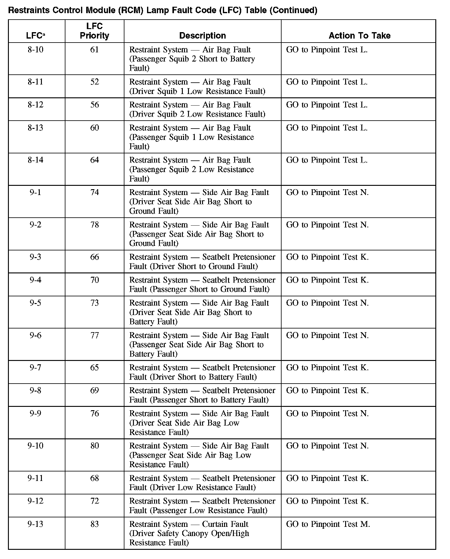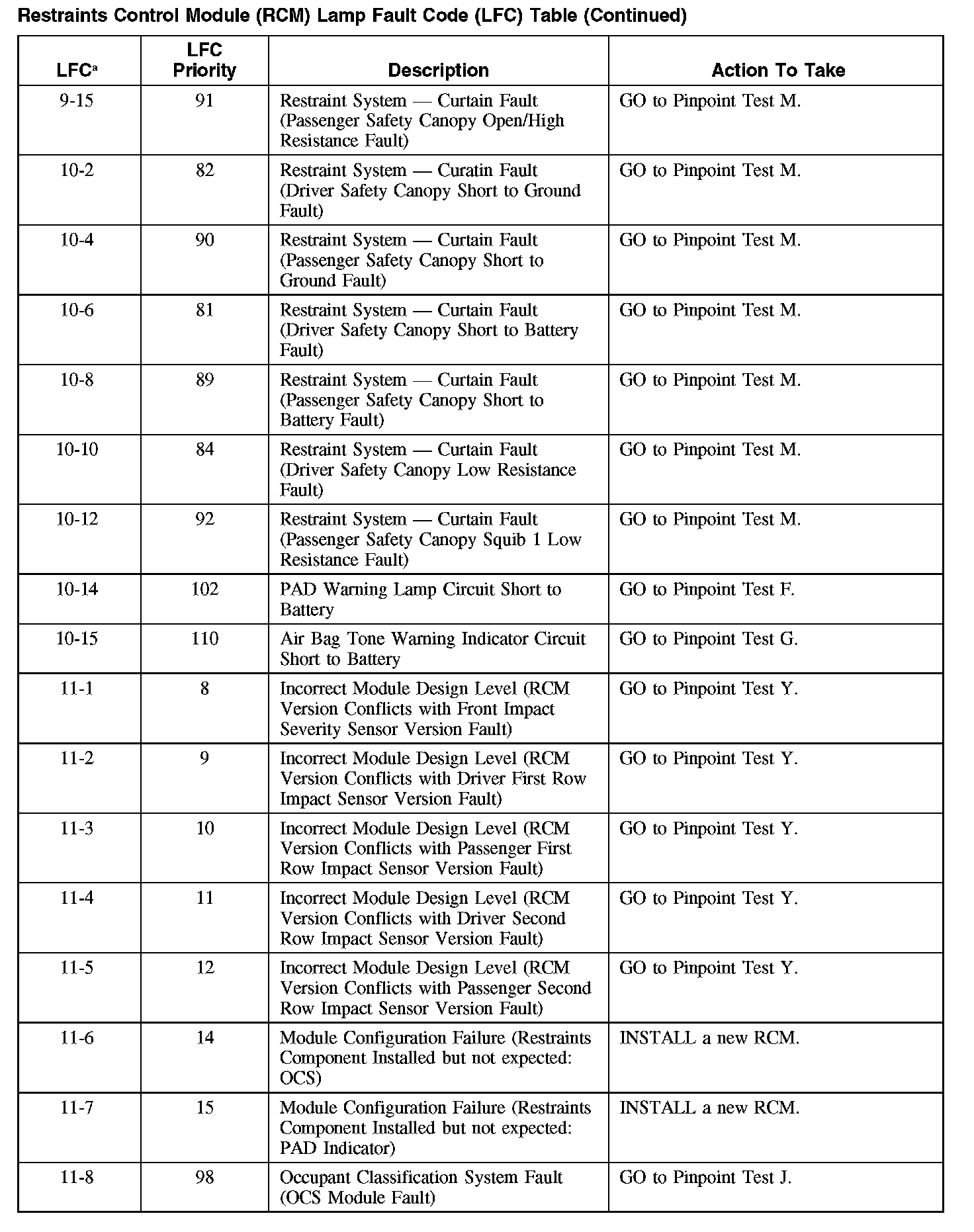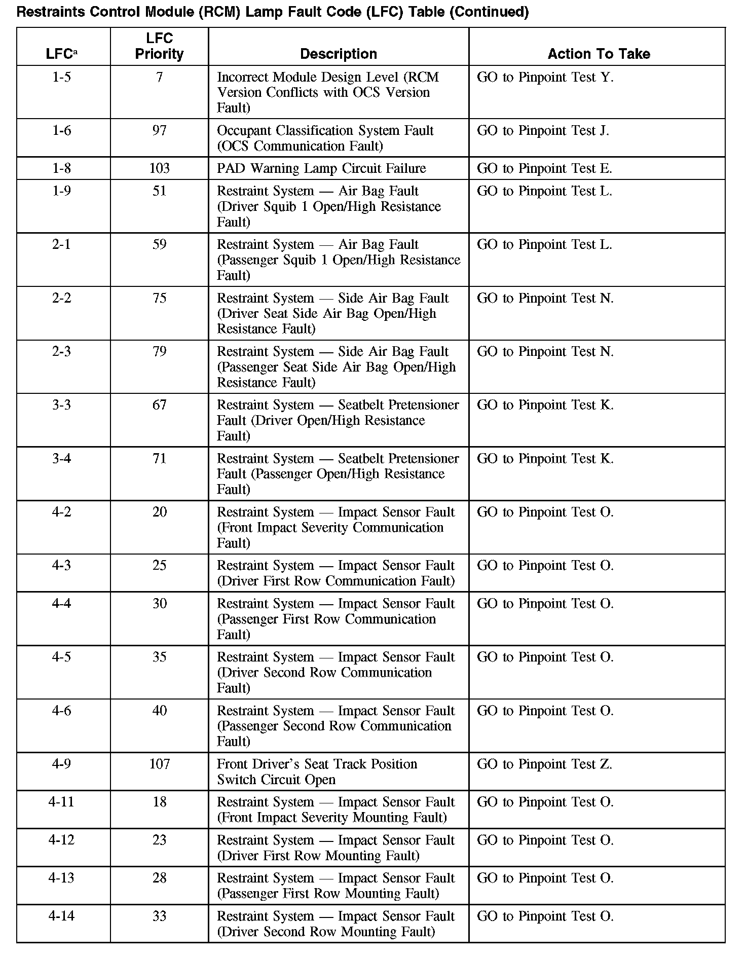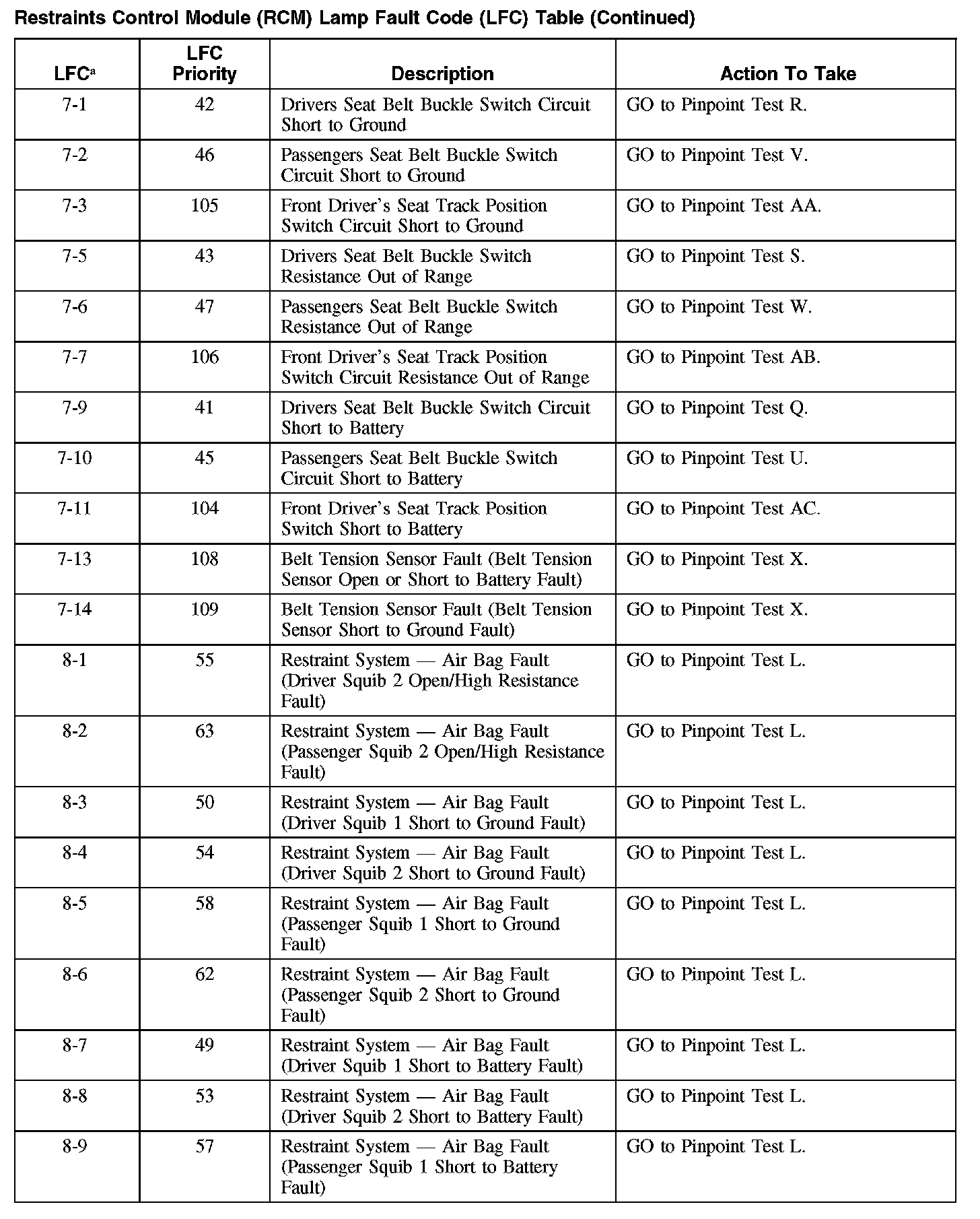 RESTRAINTS CONTROL MODULE (RCM) LAMP FAULT CODE (LFC) TABLERestraints Control Module (RCM) Lamp Fault Code (LFC) Table (Part 1):