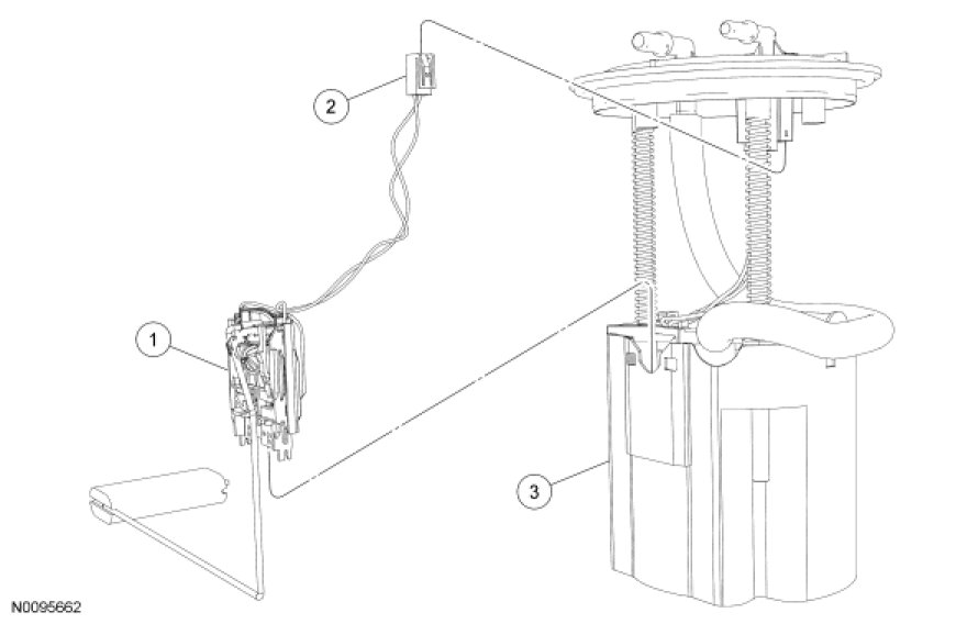 2. Disconnect the electrical connector, release the locking tabs and remove the fuel level sender from the FP module.