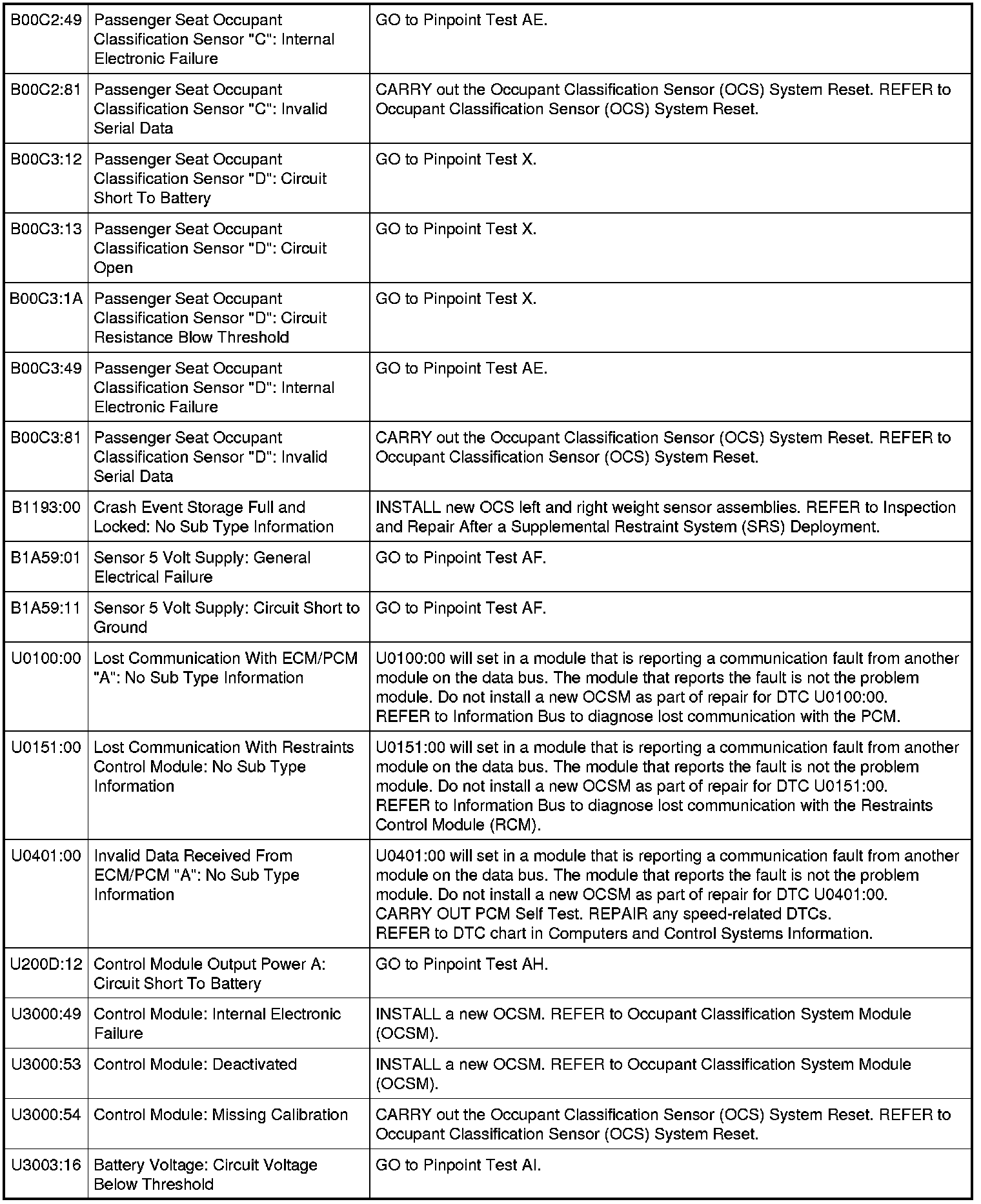Occupant Classification System Module (OCSM) DTC Chart