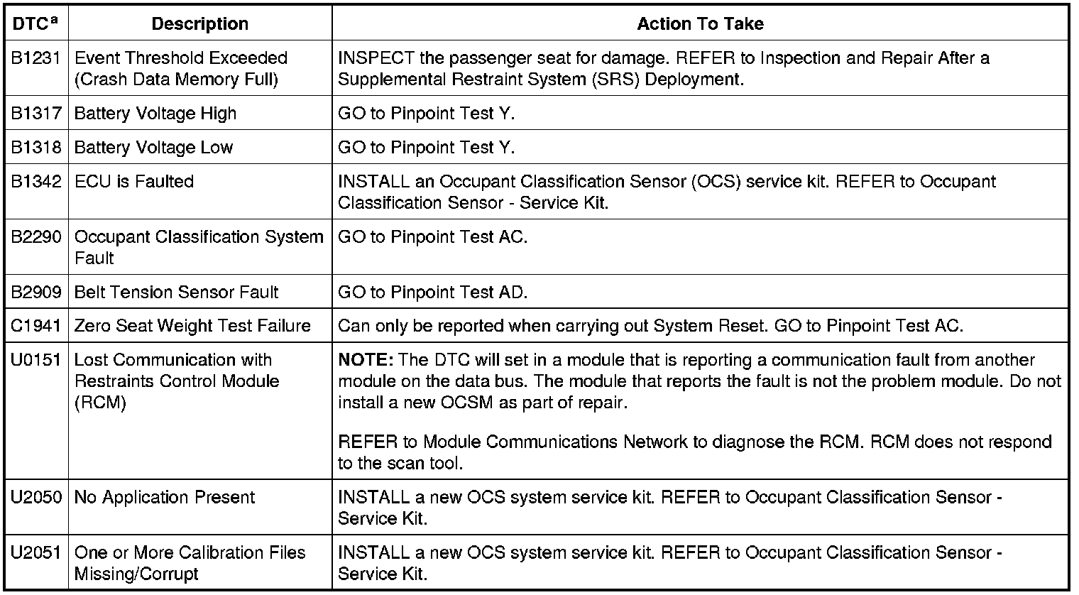 Home >> Mercury >> 2011 >> Mariner 4WD L4-2.5L >> Repair and Diagnosis >> Restraints and Safety Systems >> Air Bag Systems >> Testing and Inspection >> Diagnostic Trouble Code Tests and Associated Procedures >> Occupant Classification System Module (OCSM) DTC Chart