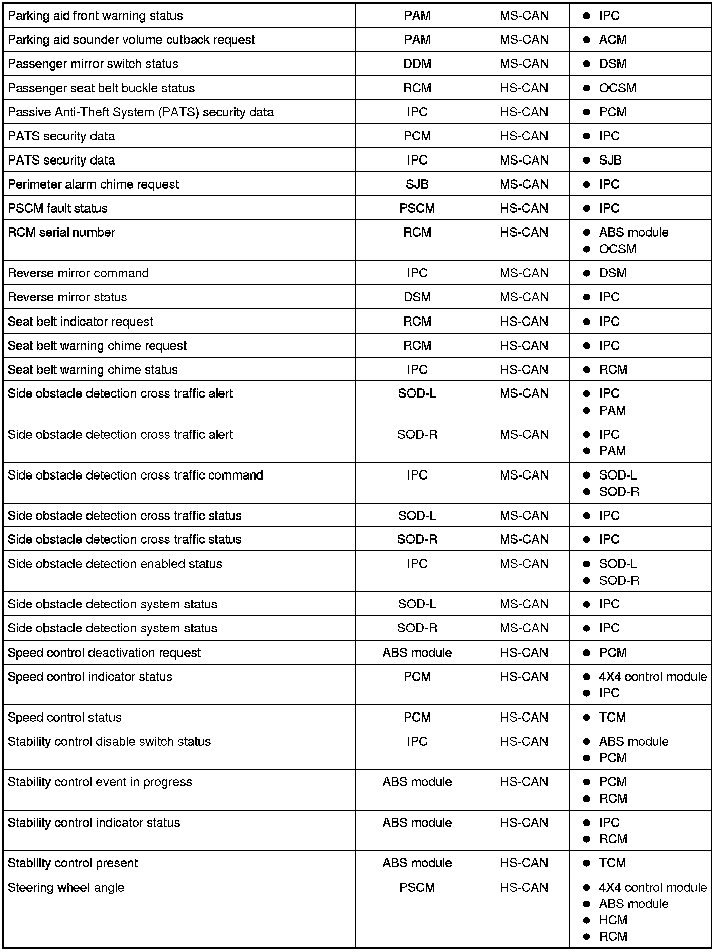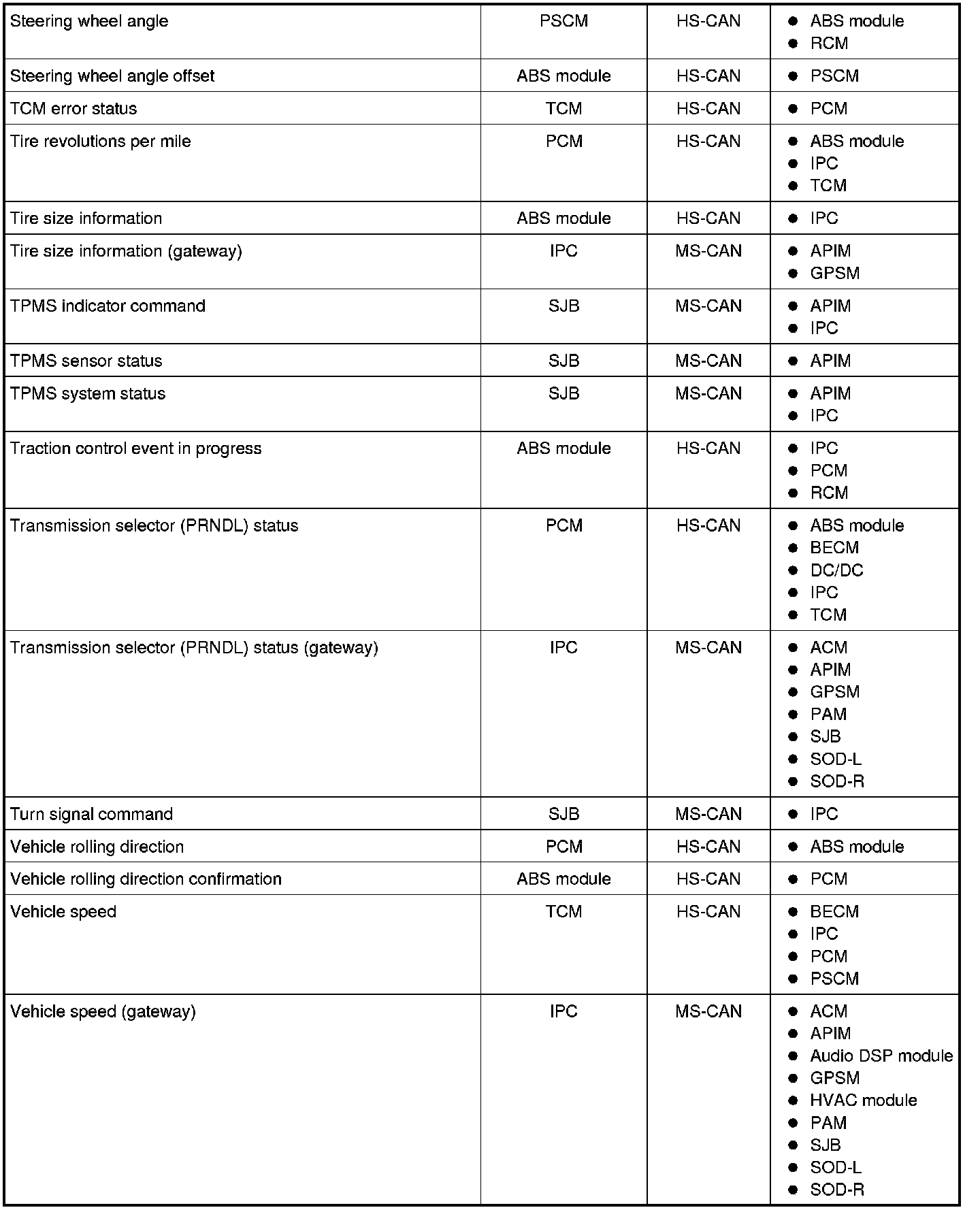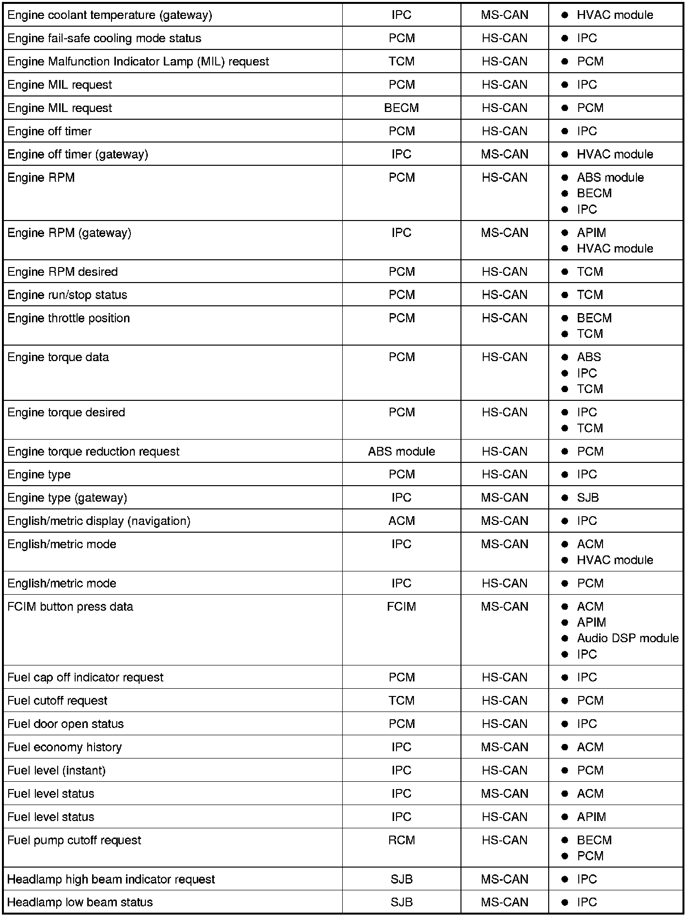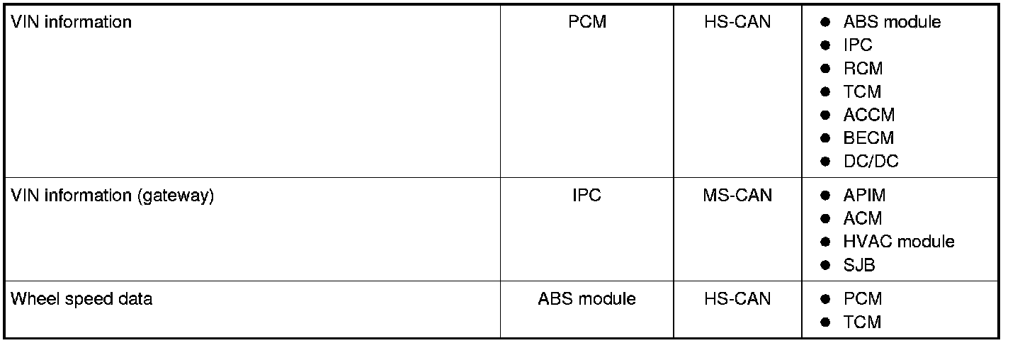 NOTE: This chart describes the specific HS-CAN and MS-CAN messages broadcast by each module, and the module(s) that receive the message.