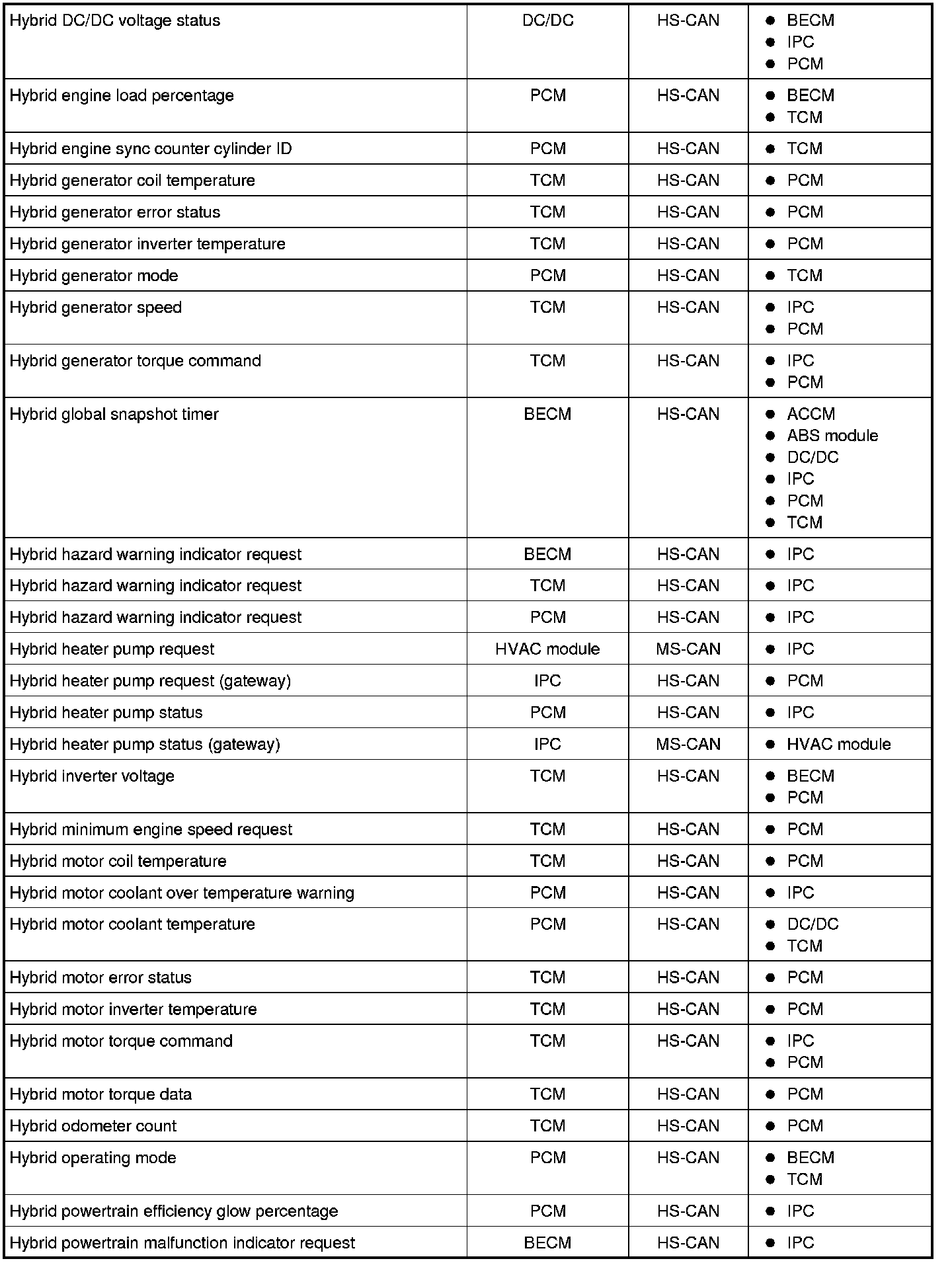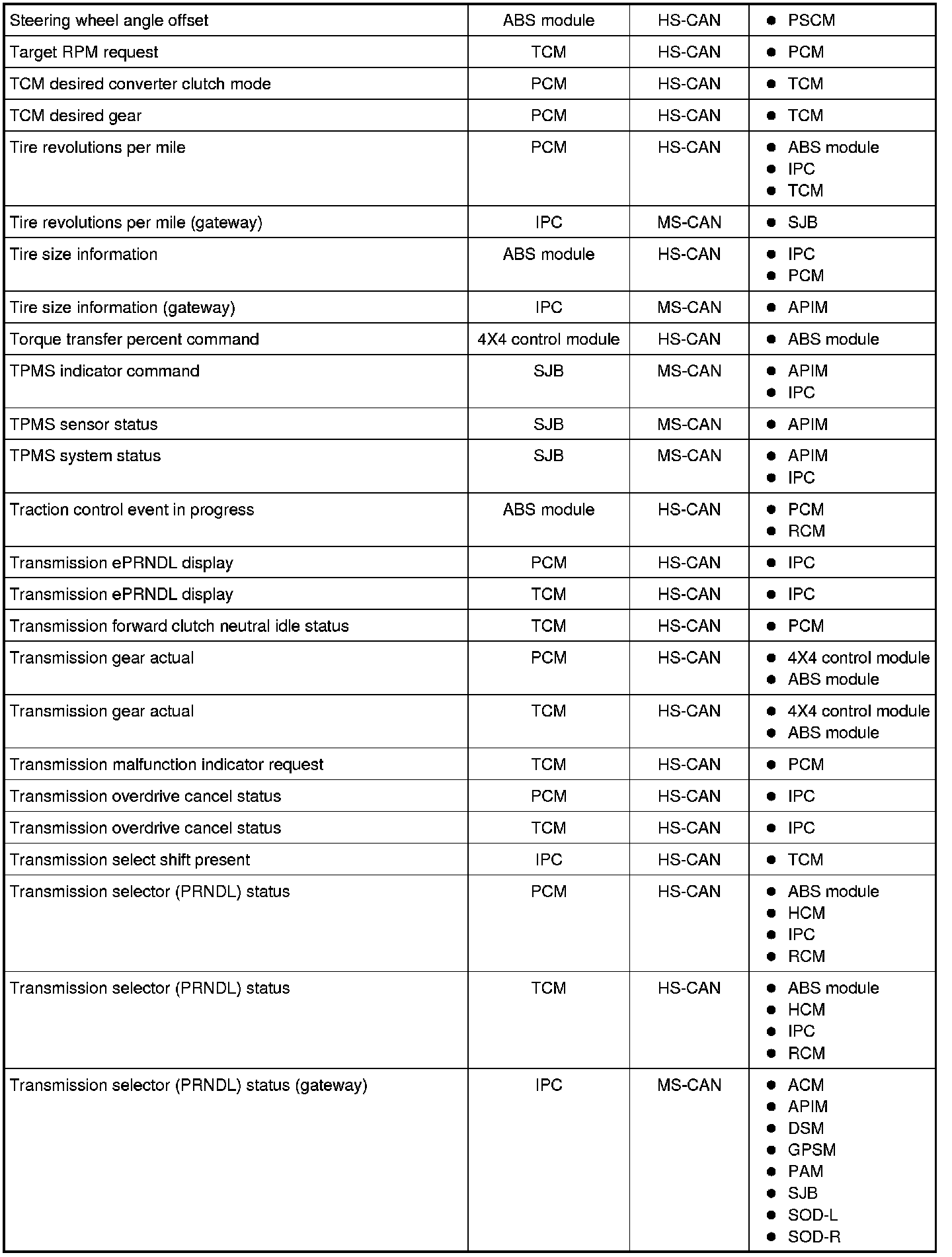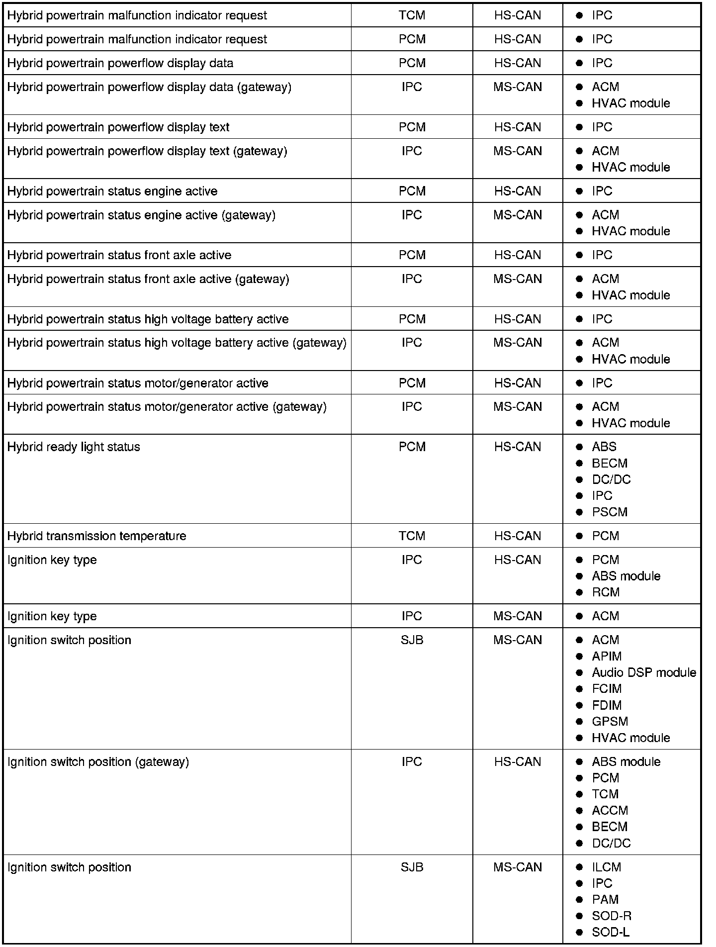NOTE: This chart describes the specific HS-CAN and MS-CAN messages broadcast by each module, and the module(s) that receive the message.