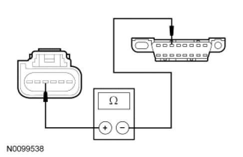 - Measure the resistance between the SOD-R C4229-4, circuit VDB06 (GY/OG), harness side and the Data Link Connector (DLC) C251-3, circuit VDB06 (GY/OG), harness side.