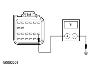 - Measure the voltage between the RCM C310a-13, circuit CBP32 (GN/VT), harness side and ground.