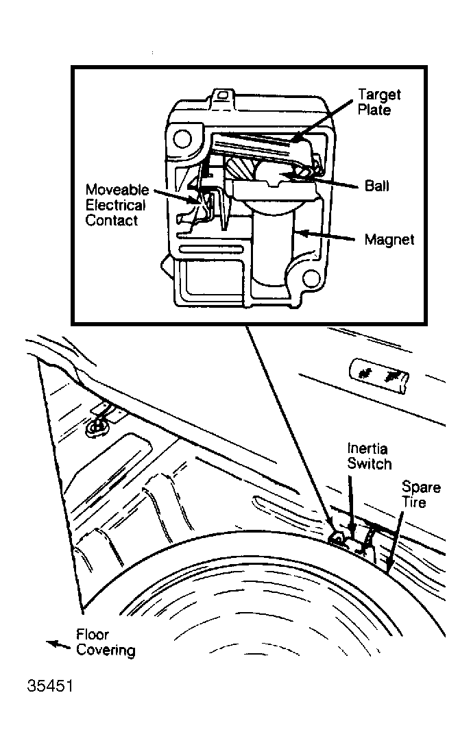 The inertia switch is located at the center rear of the spare tire well. The inertia switch components are contained in a glass filled polyester case. These components include a magnet ball target plate, movable electrical contact and a reset lever.