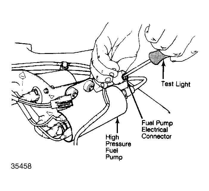 - Separate high pressure pump wiring connector and connect test light from ground to Black/Red wire in harness side of wiring connector. Have helper turn ignition switch to "RUN" position and watch test light. If light comes on for about one second, test is okay. Go to test 8). If test is not okay, repair open in feed circuit.