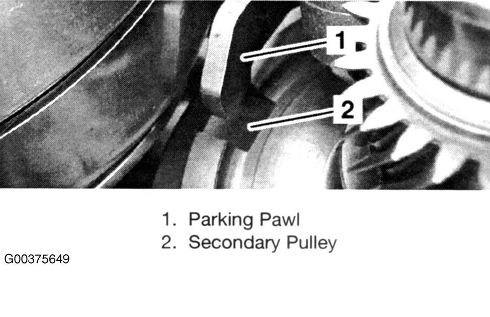Selection of the required driving mode, through the selector lever inside the vehicle, activates a selector shaft within the transmission. A push/pull type cable connects the lever in the car and the shaft on the gearbox. A cam fitted to the selector shaft is also connected to the manual valve of the control system, and selects one of its five desired positions (PRNDS/M). Moving the selector lever across the gate trips a proximity sensor. A spring and cone operated pawl mechanically locks the secondary pulley when the selector lever is moved to the Park position. If selection of park is made at speed the pawl will rattle without engaging Park. It will not engage until the vehicle speed drops below approximately 3 mph. See Fig 1 .