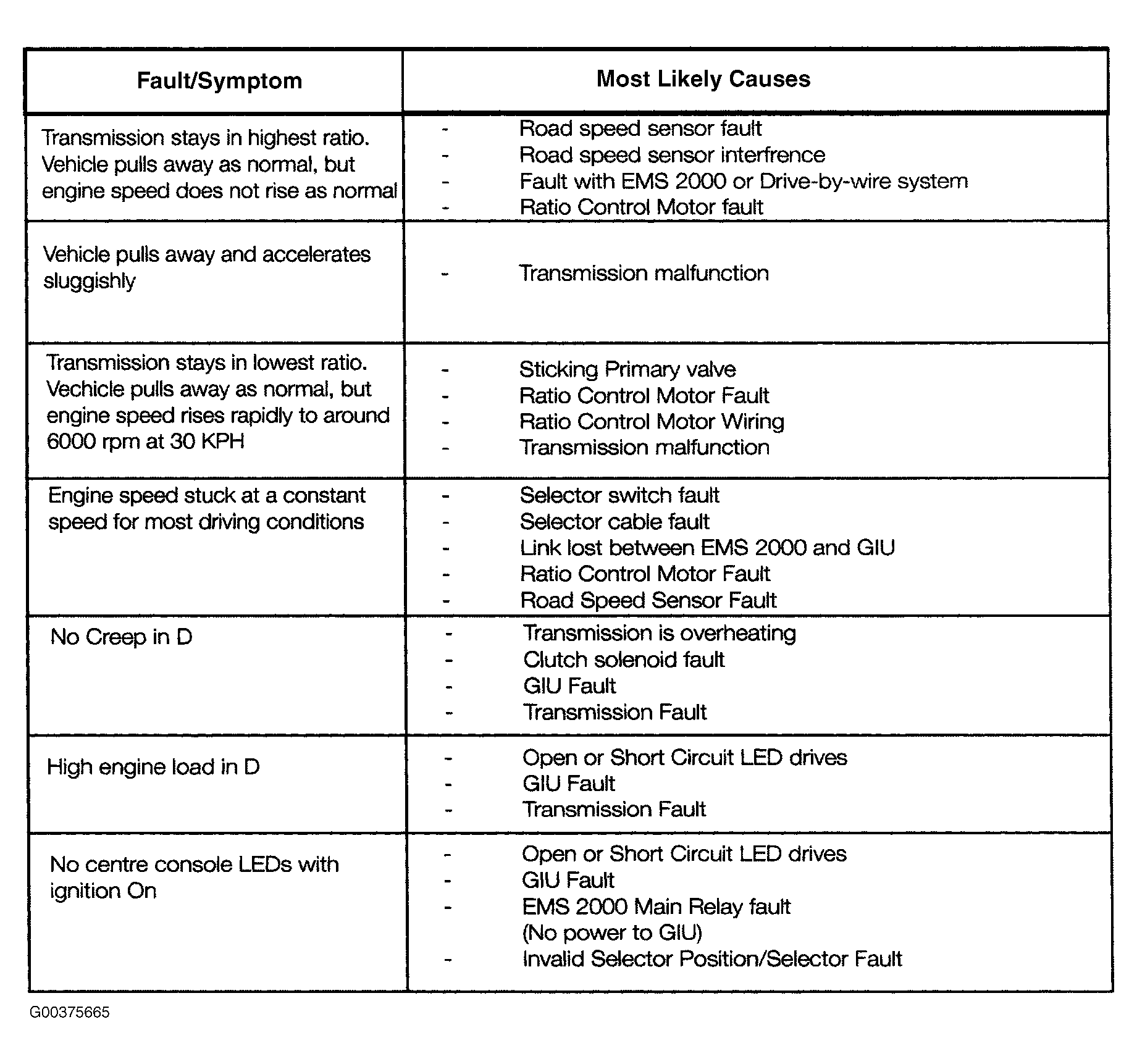 Once the operation of the EMS 2000 has been established, the GIU operation should be established. The CAN link between the GIU and the EMS 2000 can be verified by observing the LCD display in the instrument cluster. The display should change in accordance with the gear lever selector and is an indication that the selector switches are operational and the drive from the EMS 2000 to the instrument cluster is operational. If the ratio control motor is suspected to be faulty the following procedure can be carried out to confirm its state. See Fig 1 .