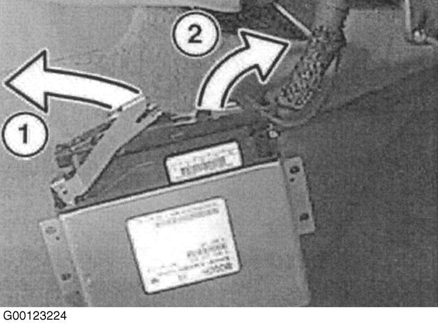 - Press detent for control unit downward (1). Tilt control unit to left at bottom out of bracket (2). See Fig 3 .