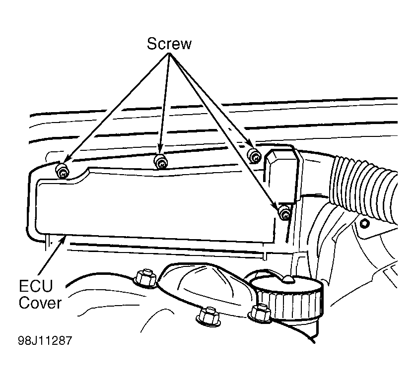 ECU is located behind cover on firewall in right rear of engine compartment. On 4-cylinder vehicles, remove battery. On all vehicles, remove 4 ECU cover screws. See Fig 1. Unlock electrical connector retainer. Disconnect electrical connector. Slide out ECU. See Fig 2. To install, reverse removal procedure.