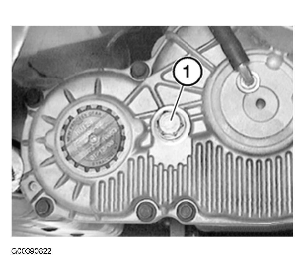 Place oil collecting apparatus underneath. Remove oil drain plug (2). Drain and dispose of gear oil. Replace sealing ring, screw in oil drain plug (2) and tighten down. See TORQUE SPECIFICATIONS . Undo oil filler plug (1). Pour in gear oil up to lower edge of opening for oil filler plug (1). See Fig 1 . Replace sealing ring.