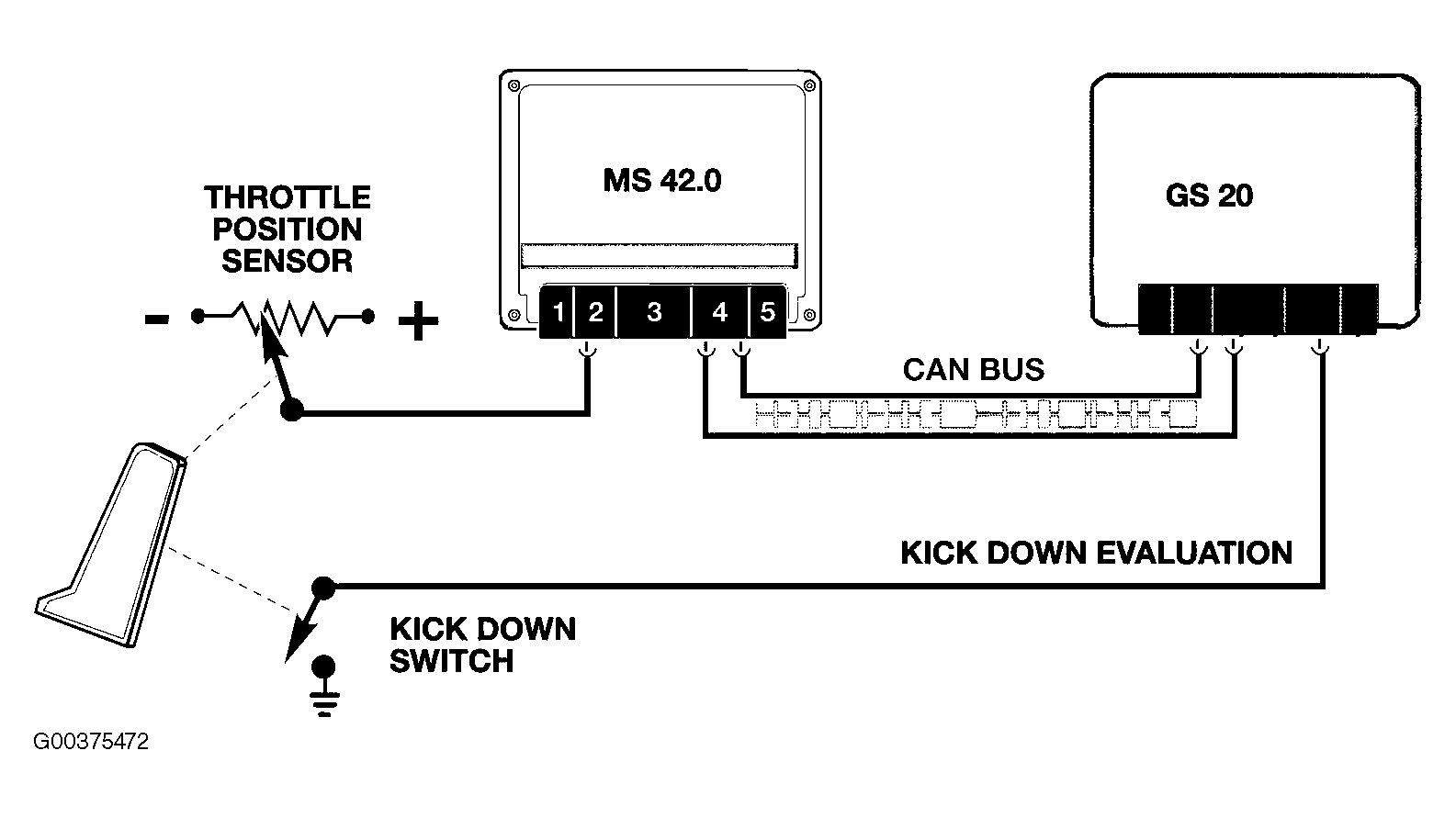 The adaptive drive program is based primarily on throttle input from the MS 42.0 control module via the CAN bus. The calculated rate of pedal position change influences the selection of the shift points. Moderate movement causes moderate downshifts while a quick application of the throttle initiates a downshift. The GS 20 also monitors braking and kickdown request. Economical driving: Shifter in D. Drive with slow application of throttle. This provides low and comfortable shift points providing high fuel efficiency. Quick accelerator pedal activity automatically leads the GS 20 into the intermediate power mode. Based on this input data, the AGS automatically selects a sporty shift strategy. Sport: Shifter in "D", shift points are higher to take advantage of the full engine performance. The sport program is also immediately activated by a kick down request or excessive braking. See Fig 1 .