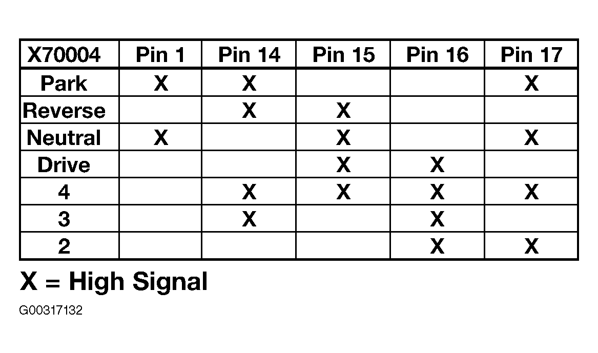 The switch is mounted inside the transmission main case on the driver's side. This location provides precise monitoring of the Manual valve position and is sheltered from the harsh environment under the vehicle external of the main case. Adjustment is not required. The range selector switch has 6 wires. The GS 20 provides the switch with 12 volts on one wire (pin 2 of connector X70004). Depending on the range selector position, the switch provides coded high signals over five wires to the GS 20. The addition of the fifth wire (pin 1) is new compared with previous four wire range selectors providing a redundant P/N signal circuit. See Fig 1 .