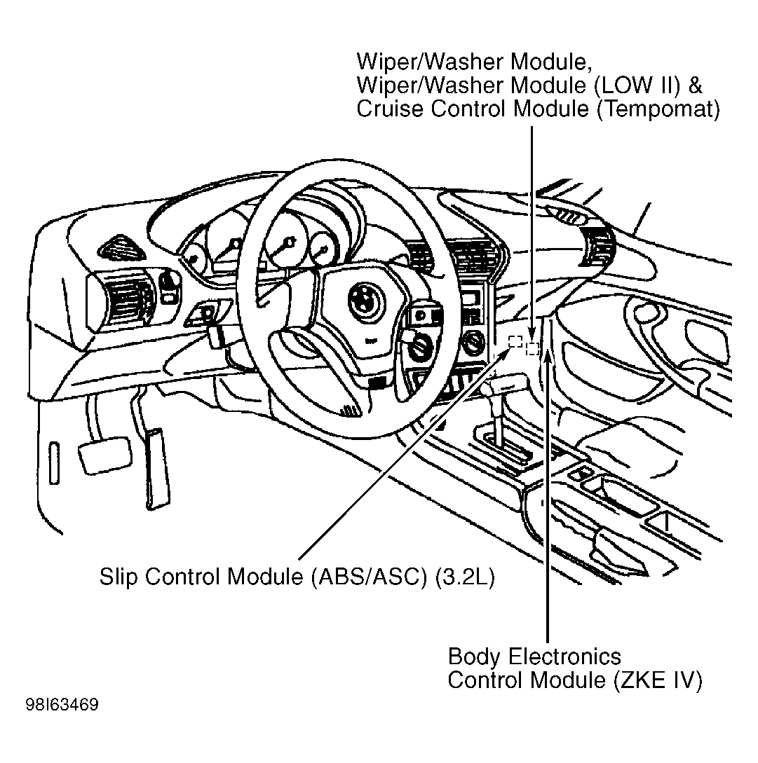 | Slip Control Module (ABS/ASC) (3.2L) | Under right side of dash, behind glove box. See Figure . |
