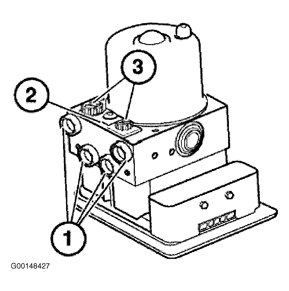 - Seal off the line connections with the plugs (1) provided in the repair kit. This prevents brake fluid from being discharged from the hydraulic unit, which makes it easier to bleed the brake system later. Secure provided retaining lug (2) from repair kit for pump motor with aid of plugs (3). See Fig 1.