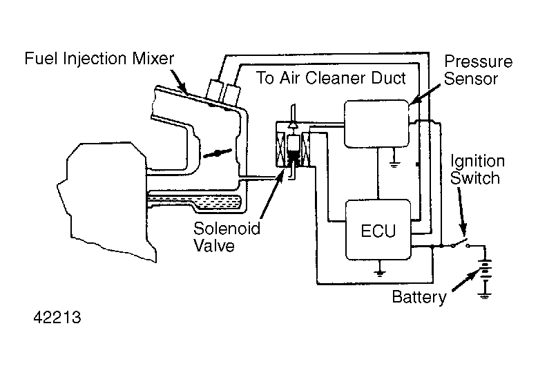 The solenoid valve is temporarily activated by ECU whenever ignition switch is turned to "ON" or "START" positions. When activated, the solenoid measures ambient barometric pressure from above throttle valve. Ambient barometric pressure changes due to weather and/or altitude. This information is sent to ECU for controlling fuel delivery time. See Fig 1 .