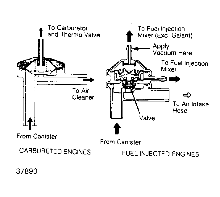 Disconnect hoses from purge control valve and remove valve. Apply 7.8 in. Hg to top vertical nipple of purge control valve. See Figure . Blow into purge control valve's port-to-canister and check that air flows through valve. Replace valve if it does not operate as outlined.