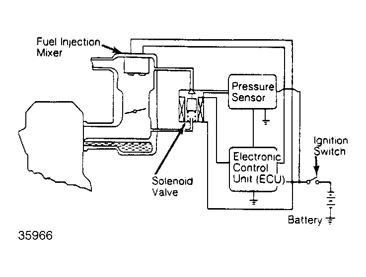 The solenoid valve is temporarily activated by ECU whenever ignition switch is turned to "ON" or "START" positions. When activated, the solenoid measures ambient barometric pressure from above throttle valve. Ambient barometric pressure changes due to weather and/or altitude. This information is sent to ECU for controlling fuel delivery time. See Fig 1 .