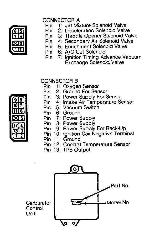 - Turn ignition switch to "OFF" position. Remove harness connectors "A" and "B" from Carburetor Control Unit (CCU). See Fig 1 .