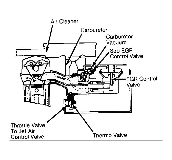 The EGR system is used to reduce Oxides of Nitrogen (NOx) in the exhaust system. The exhaust gas is partially recirculated from an exhaust port at the cylinder head into a port located at the intake manifold below the carburetor. The EGR flow is controlled by an EGR control valve, a sub valve and a thermo valve. See Fig 1 .