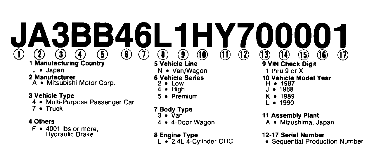 Home >> Mitsubishi >> 1987 >> Van LS >> Repair and Diagnosis >> Engine Performance >> Application >> Engine/VIN Id >> Model Identification >> VIN Code Id Explanation