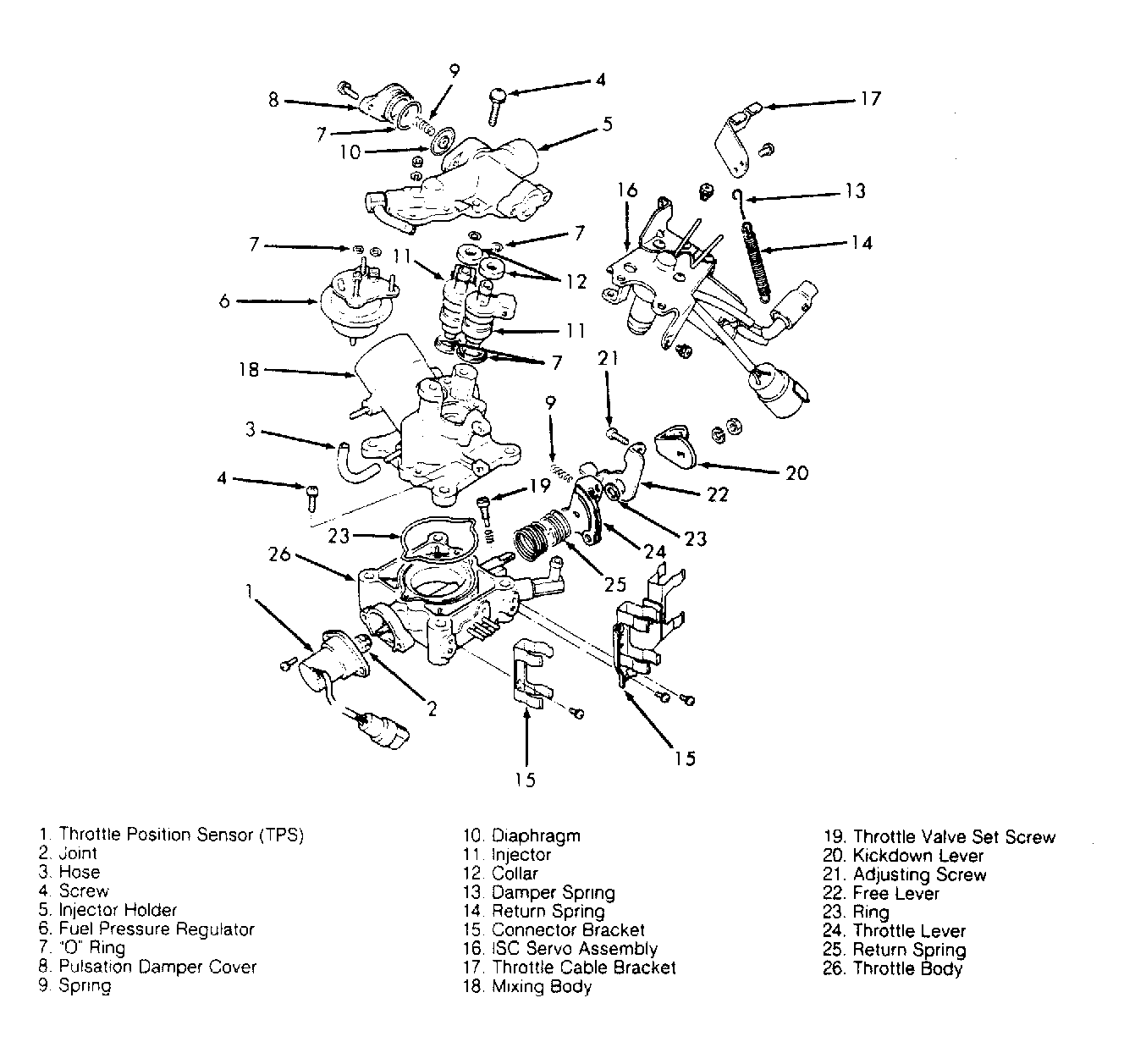 - If replacement is necessary, remove throttle position sensor. Remove injector holder, fuel pressure regulator, "O" ring and pulsation damper cover. Remove spring, diaphragm and "O" ring from injector holder. See Fig 1