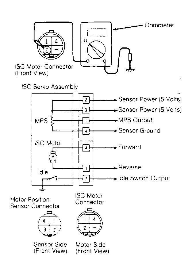 Ensure ignition switch is in "OFF" position. Disconnect ISC motor connector. Using an ohmmeter, check continuity between terminal No. 2 and ISC motor ground. See Figure . With accelerator pedal depressed, no continuity should be present. With accelerator released, continuity should be present. If as specified, replace ISC servo assembly.