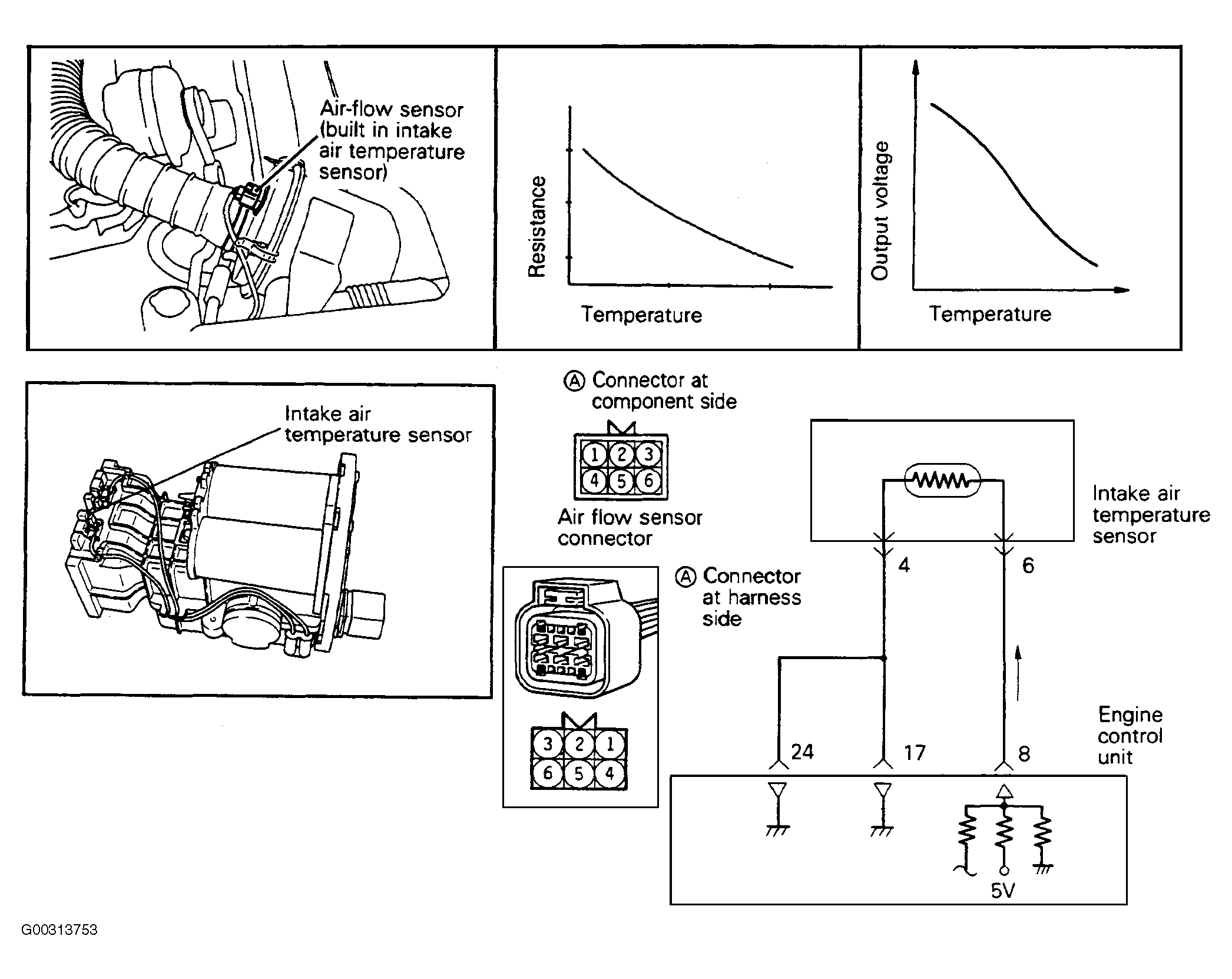 - The 5-volt power supply within the engine control unit is supplied, by way of the resistance within the unit, to the intake air temperature sensor. It passes through the intake air temperature sensor, which is a type of resistor, and is grounded at the engine control unit. Note that the resistance of the intake air temperature sensor decreases when the temperature of the intake air increases. See Fig 1